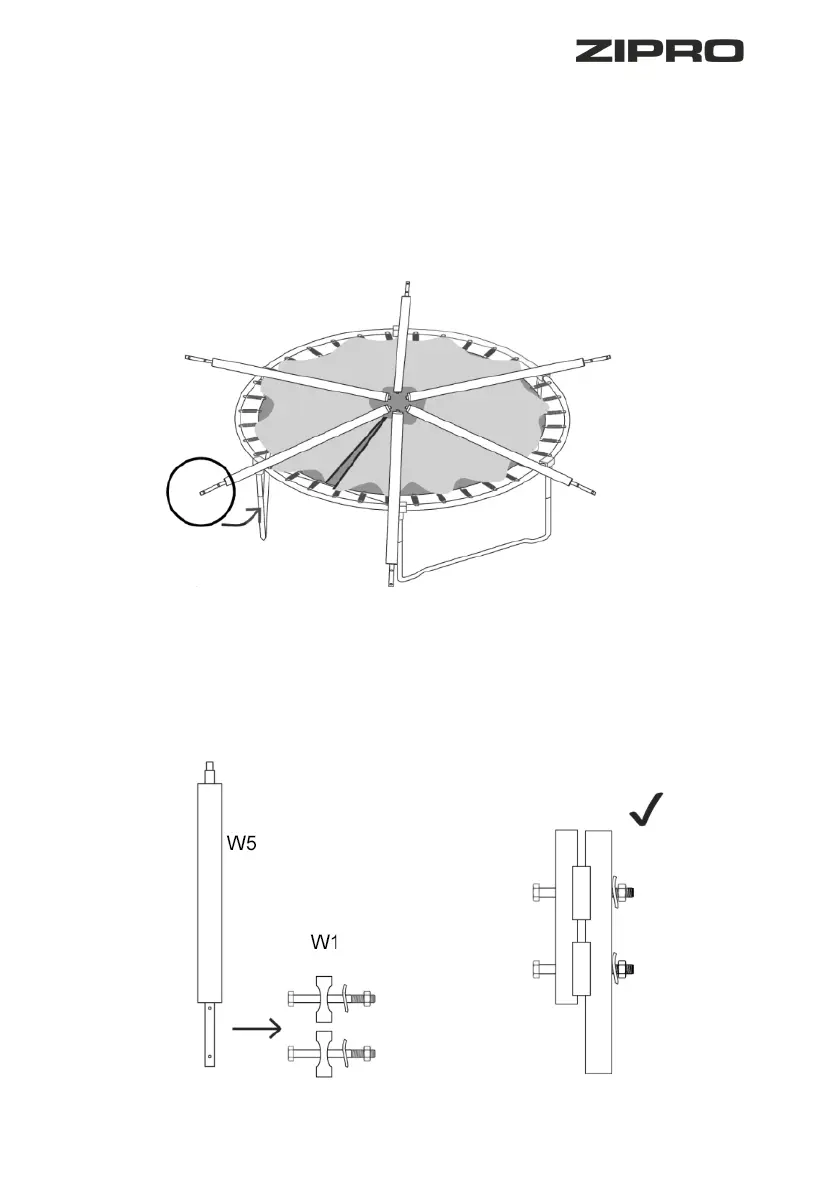 Screw the posts (W5) to the trampoline legs with bolts and nuts included in the assembly