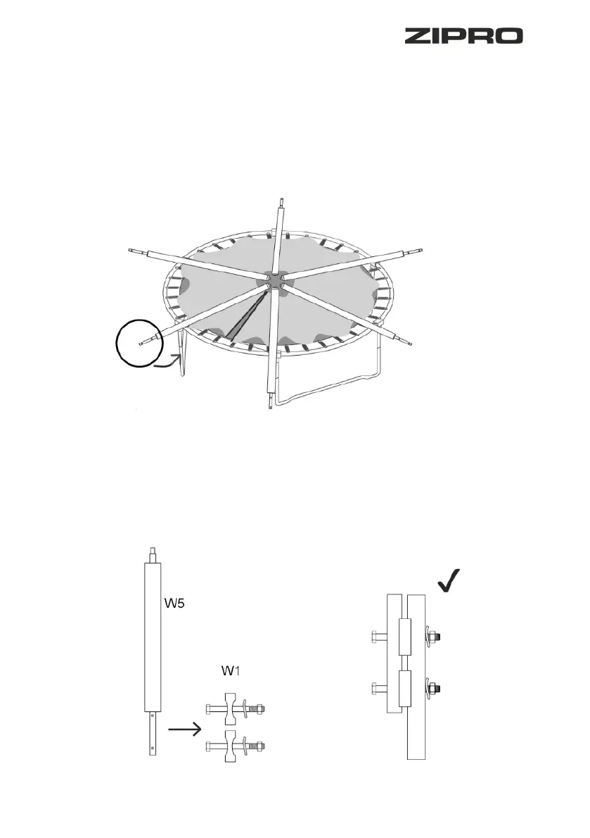 Прикрутить стойки (W5) к ножкам батута, используя болты и гайки из монтажного