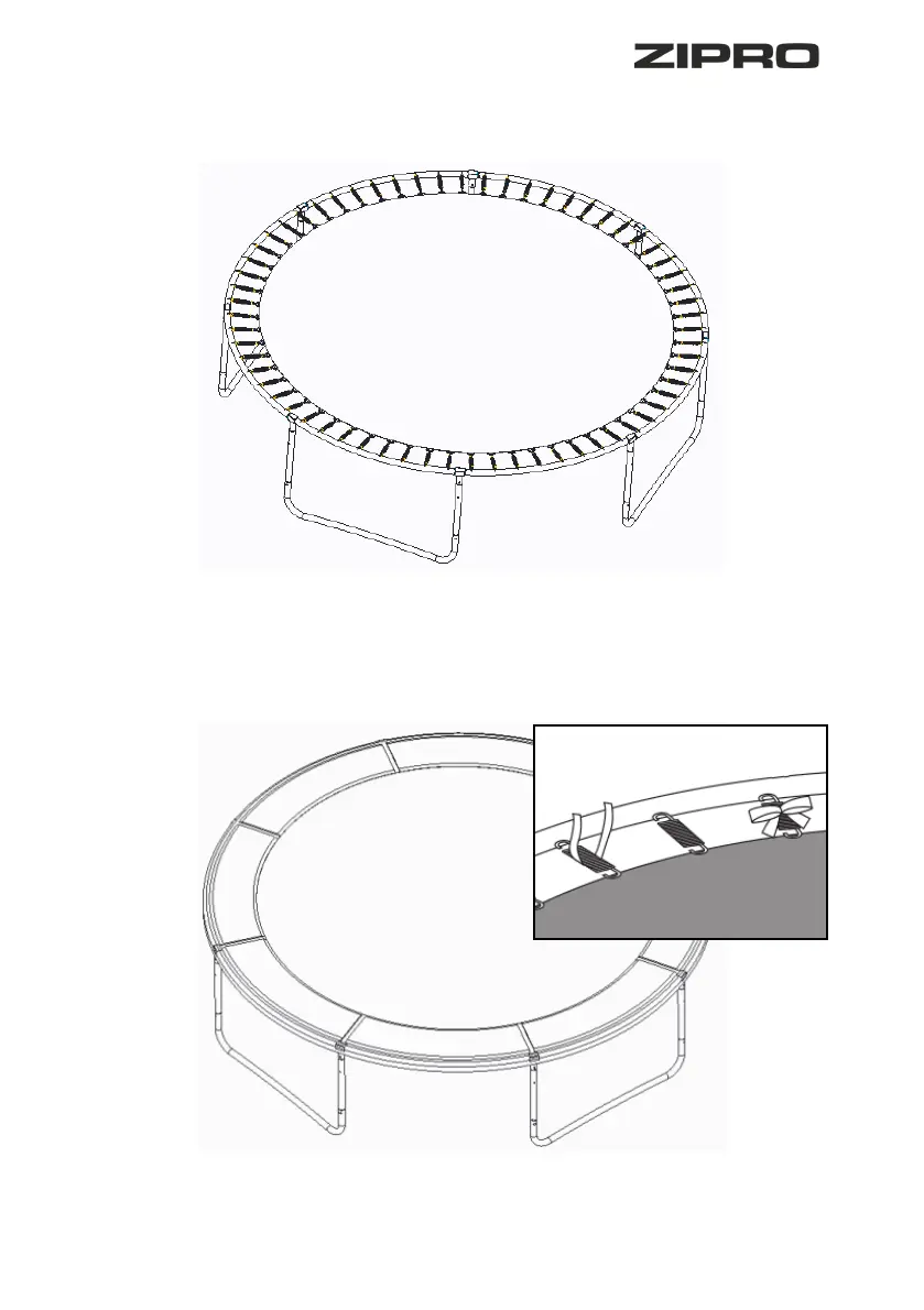 Montaţi carcasa arcurilor (B) pe rama trambulinei. Legaţi-o din partea de jos a arcurilor şi