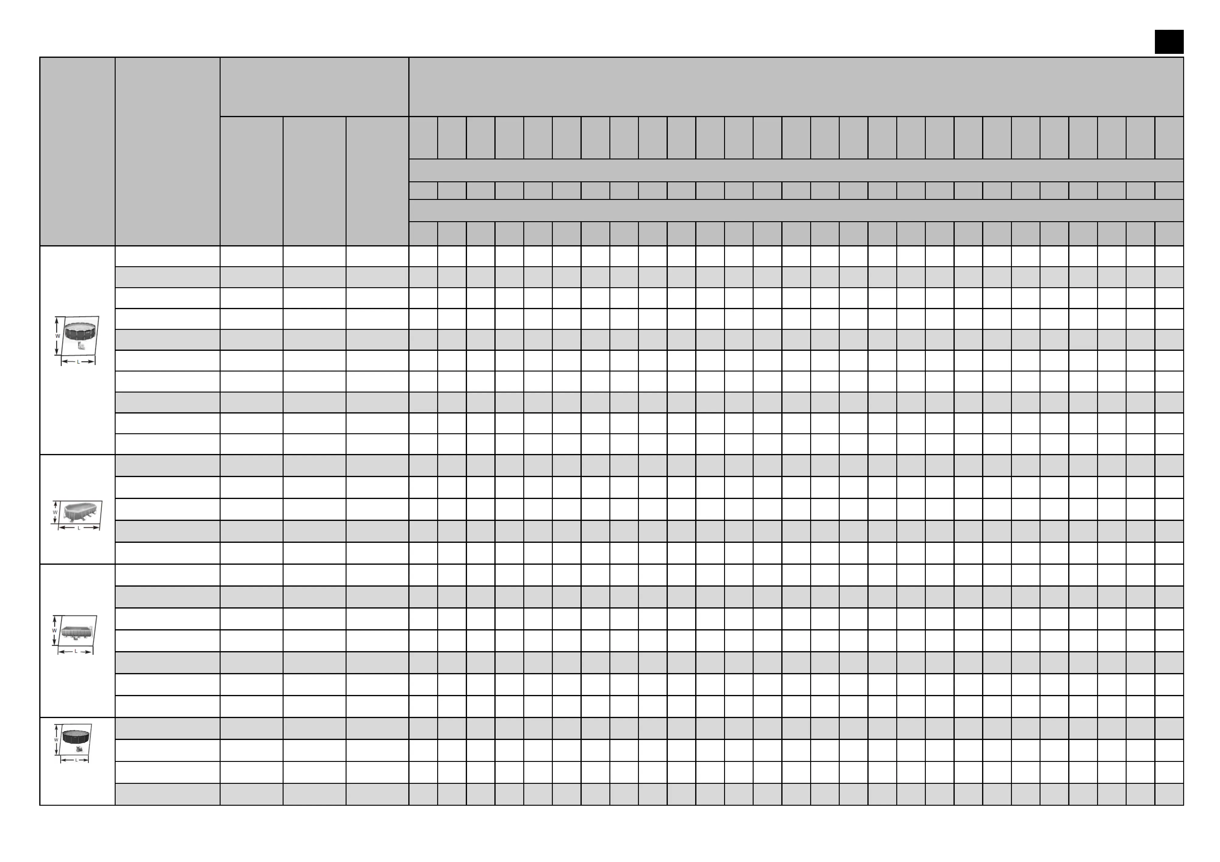 Pump running time (Hours) / Temps de fonctionnement recommandé par jour (heures) / Horas recomendadas por día (Horas) / Empfohlene Betriebsstunden pro Tag (Stunden) / Ore di funzionamento raccomandate
