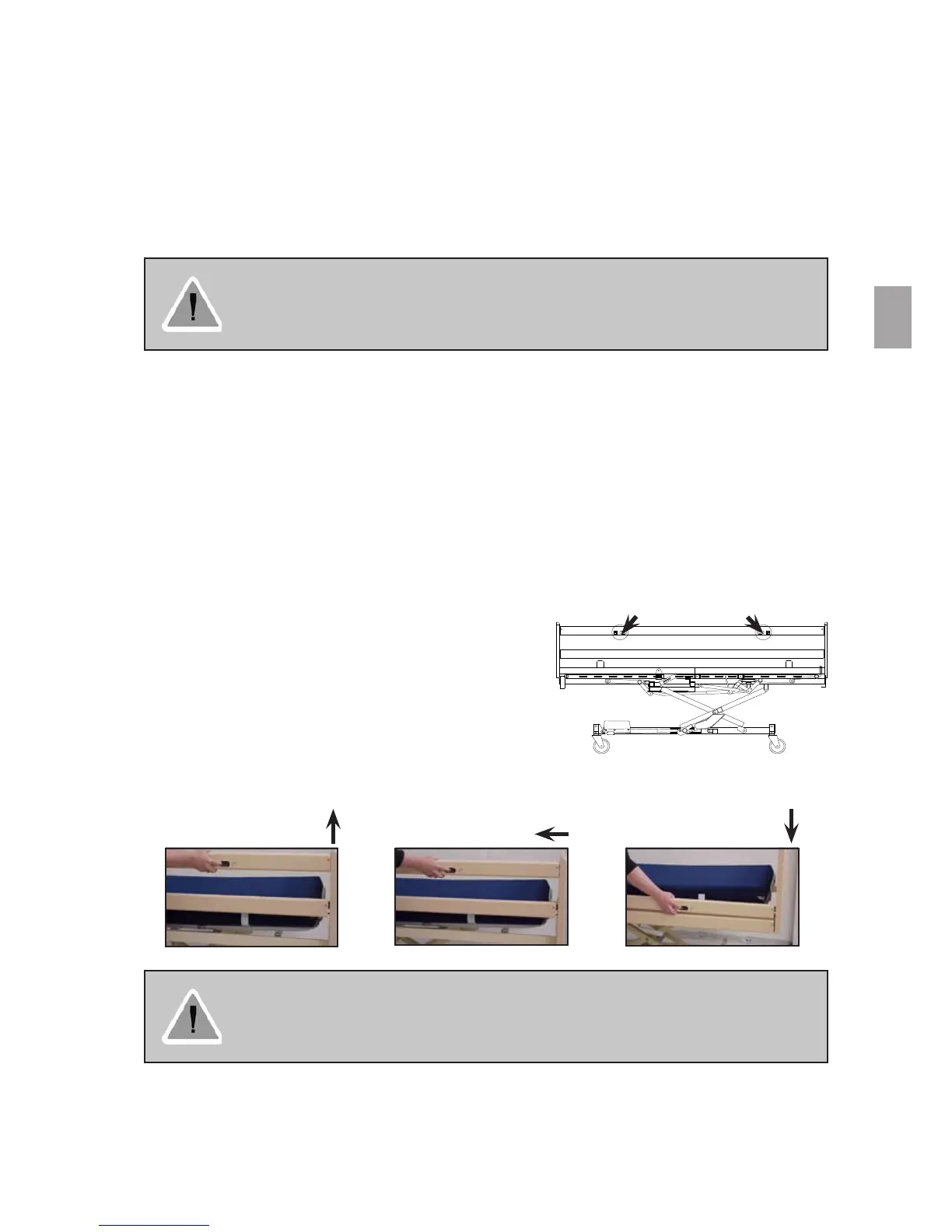 • In an emergency the mattress sections are released by pulling out the pipe pin from the motor.