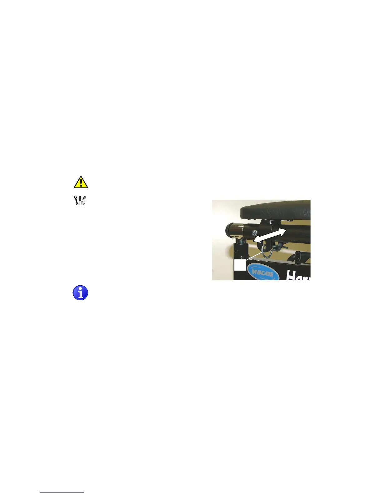 This adjustment should only be performed when the wheelchair is unoccupied. Take care not to damage any