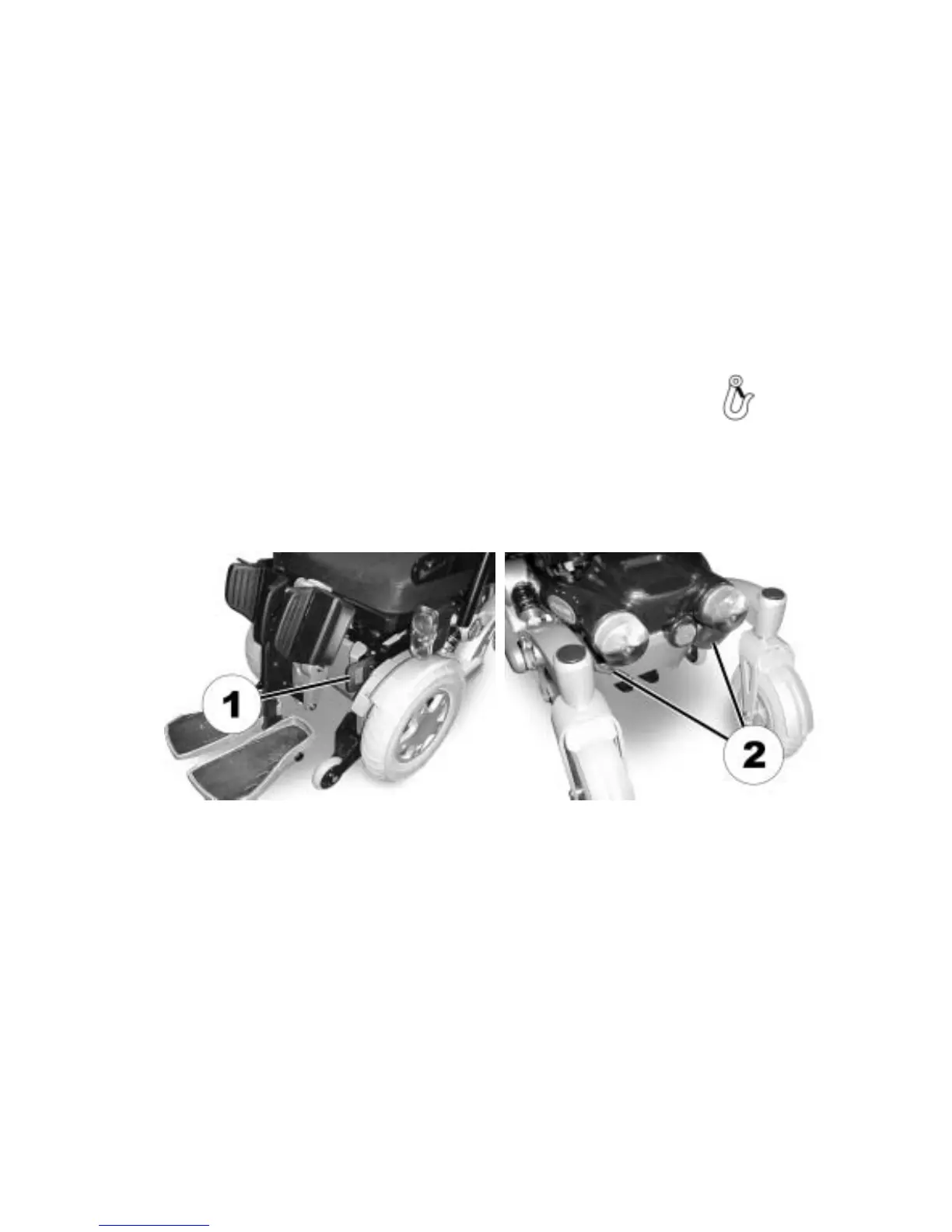 • Secure the wheelchair in the front (1) (only left side visible in the picture) and rear (2) with the