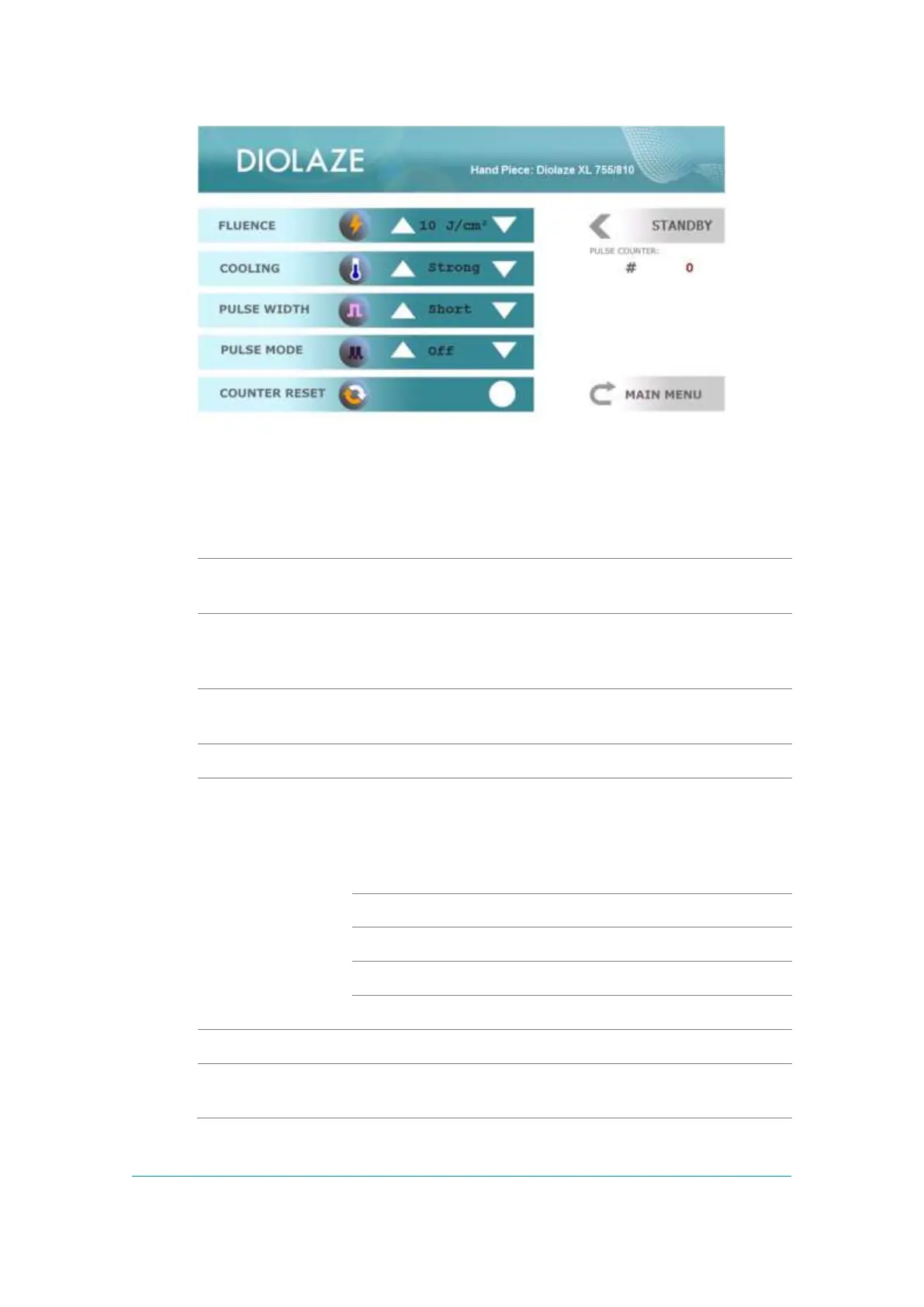 The Dioalaze/DiolazeXL Treatment Screen contains: