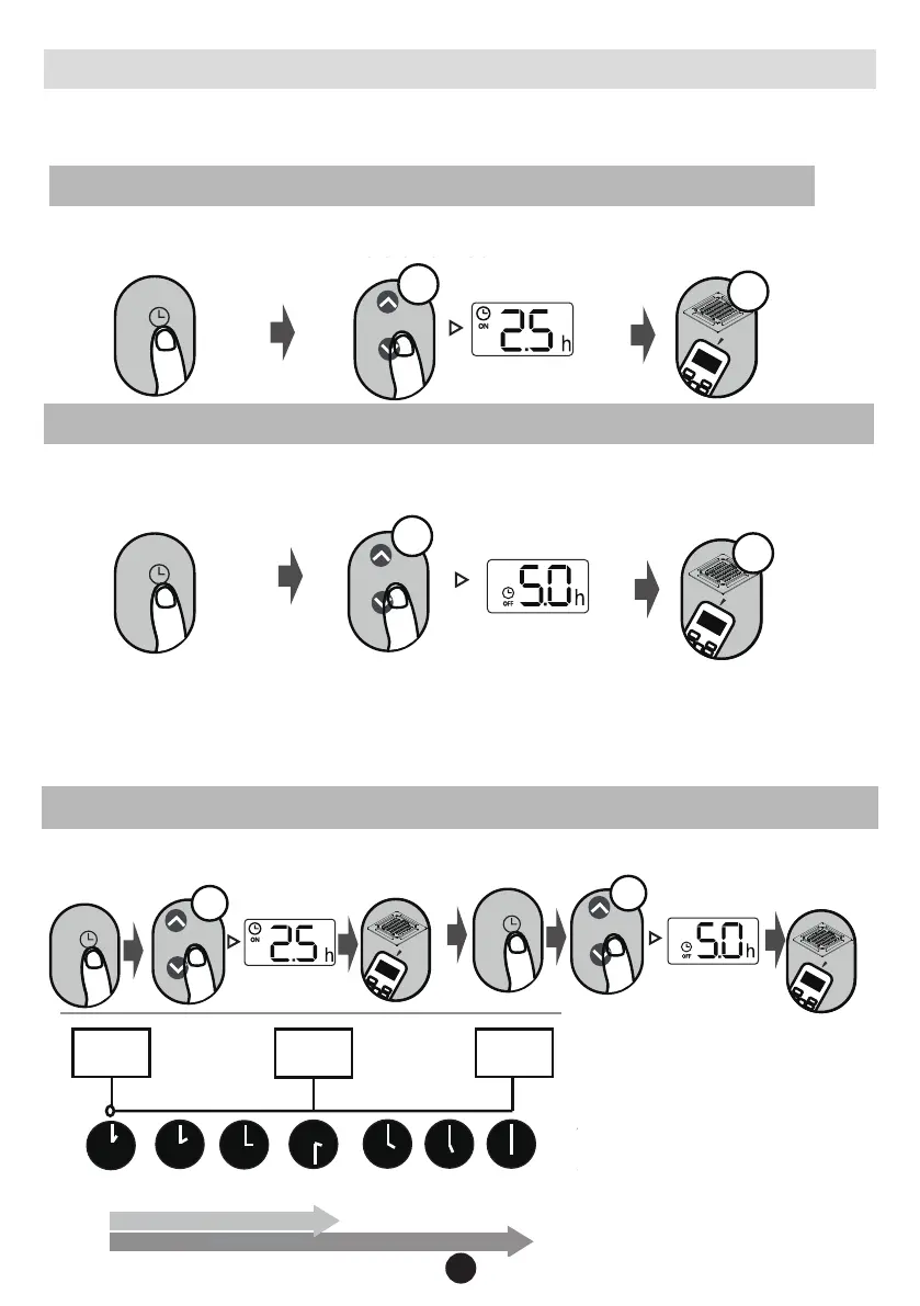press 5 times to get 2.5h, and press 10 times to get 5h,) The timer will revert to 0.0 after 24.