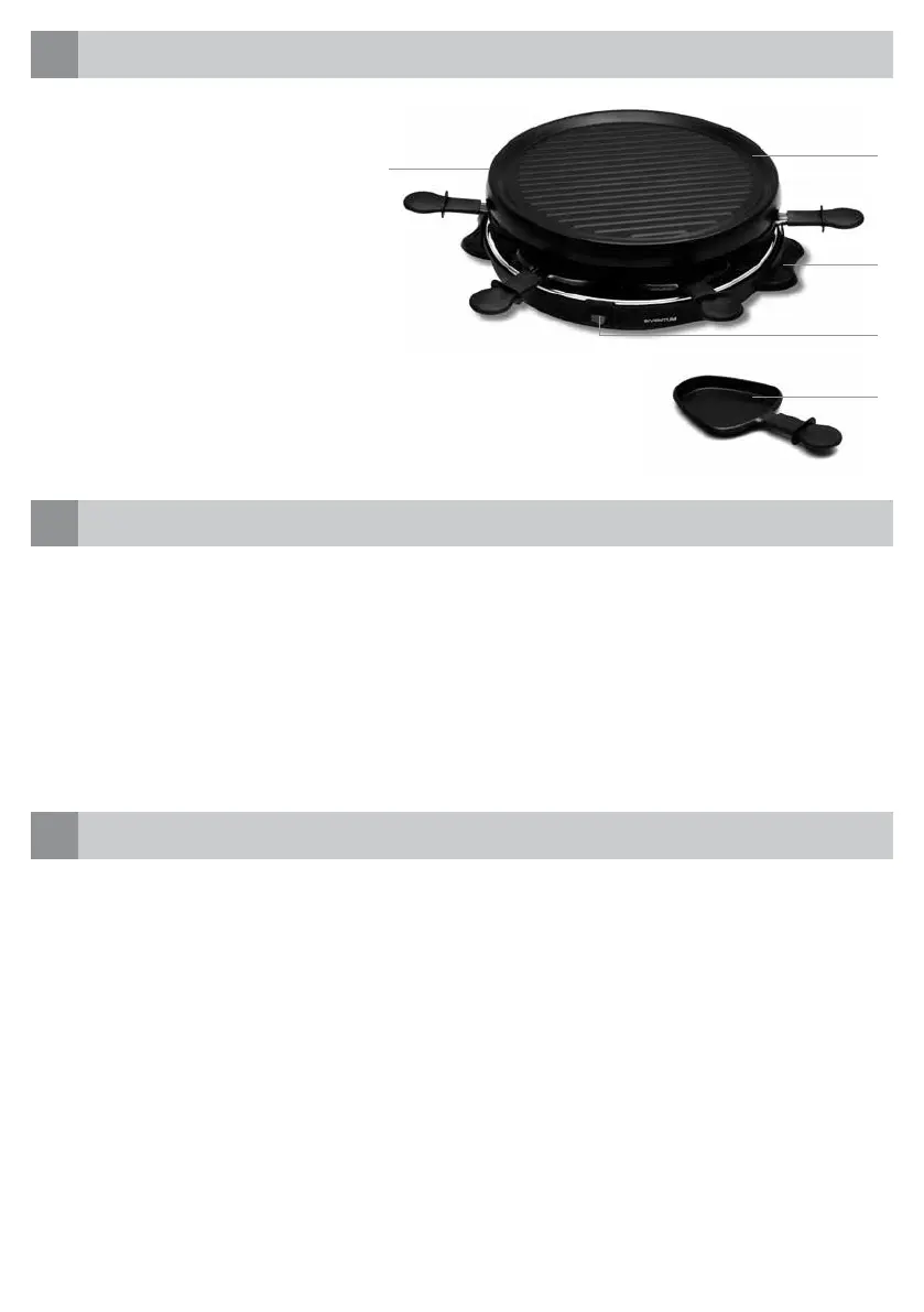 the grill plate and the pans (6 pieces) and remove all the packaging material. Keep the material (plastic bags and cardboard) out of