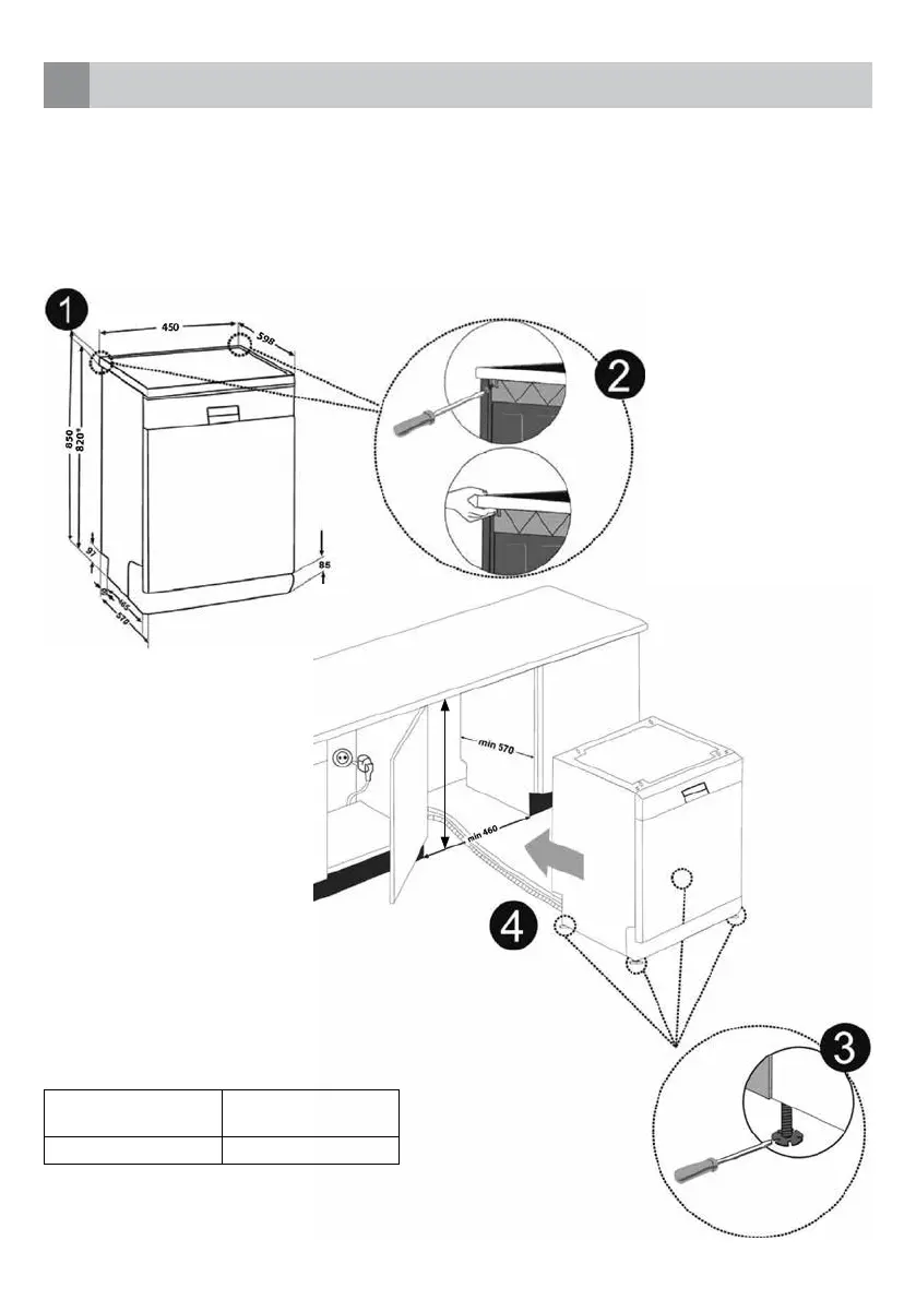• Plaats de vaatwasmachine onder het werkblad door hem op zijn plek te duwen. Let op dat u de slangen niet beschadigd