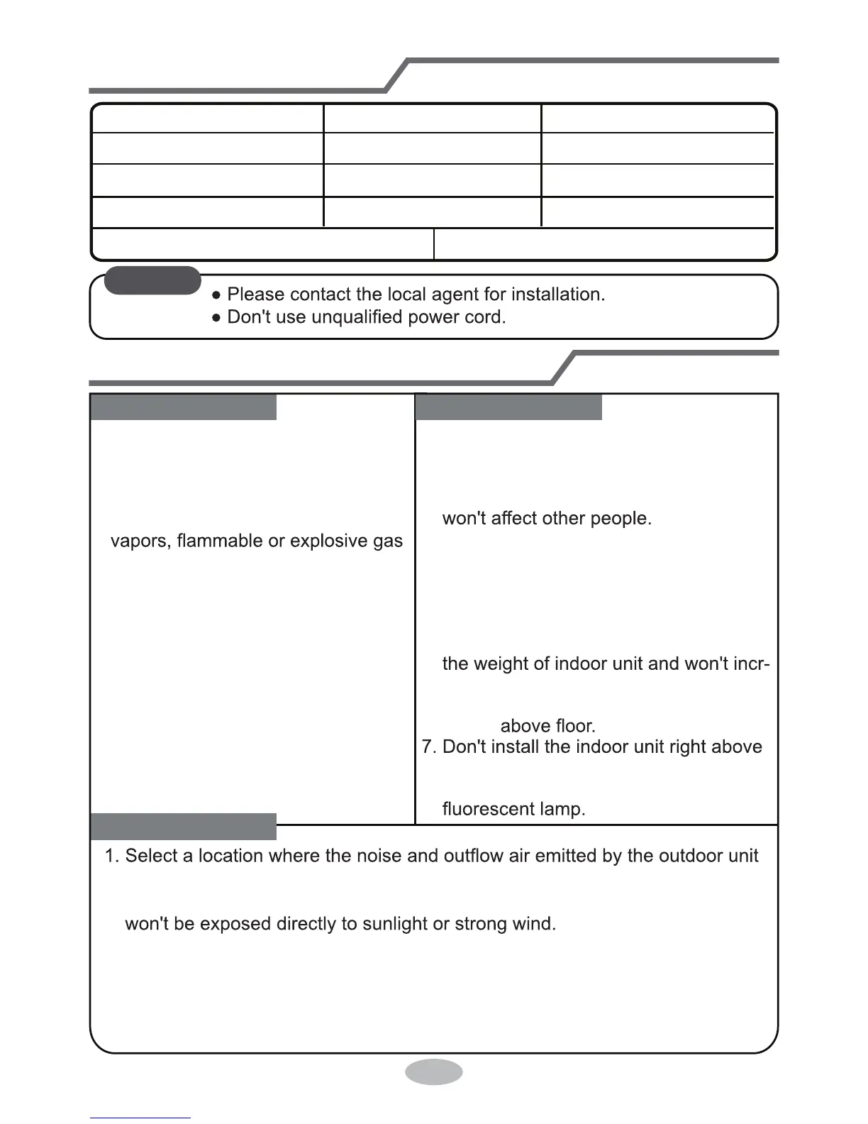 3. The location should be able to withstand the weight of outdoor unit.