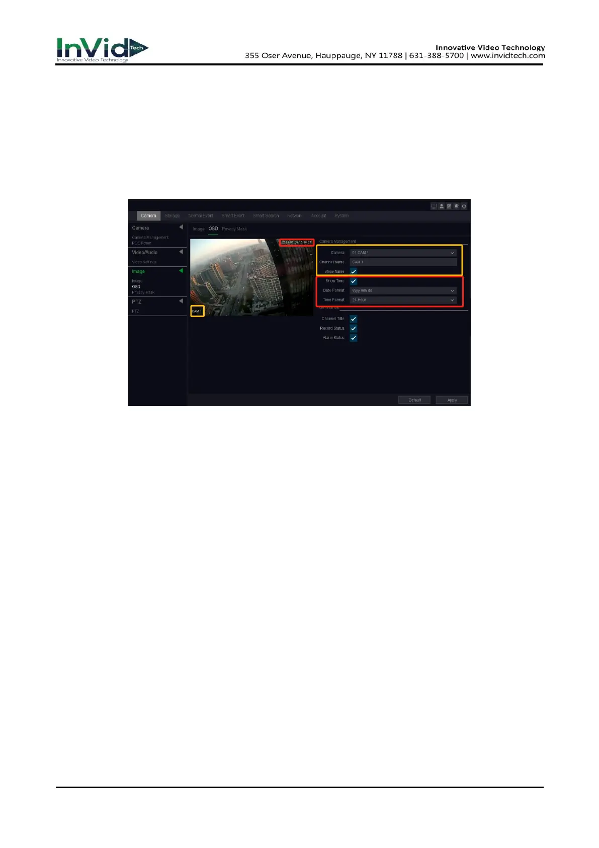 Configure OSD (On-Screen Display) settings for the camera, including date format, camera name,