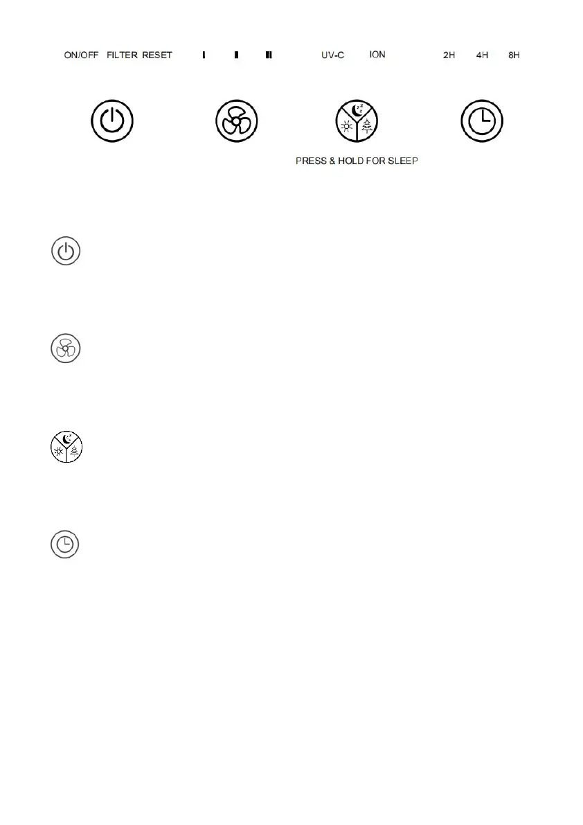 Press this button to turn on/off the UV, ION, and SLEEP mode.