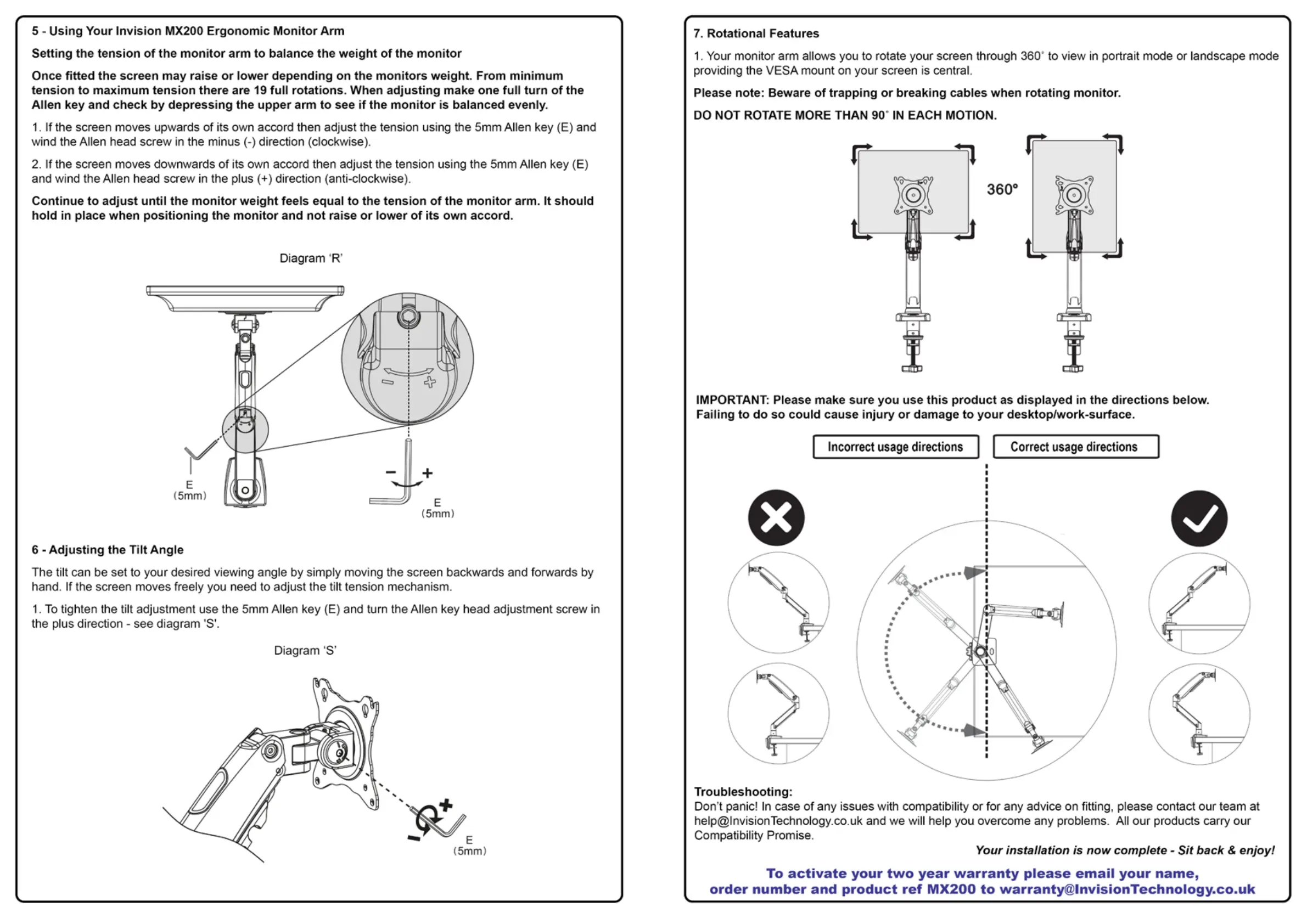 Invision MX200 - Arm Tension and Tilt Adjustment; Adjust Monitor Arm Tension; Adjust Tilt Angle Tension; Rotational Features