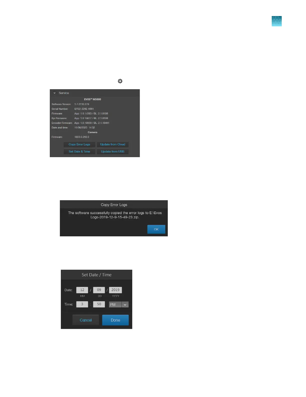 copy error logs, set date and time, and update software and firmware from the cloud or the USB flash