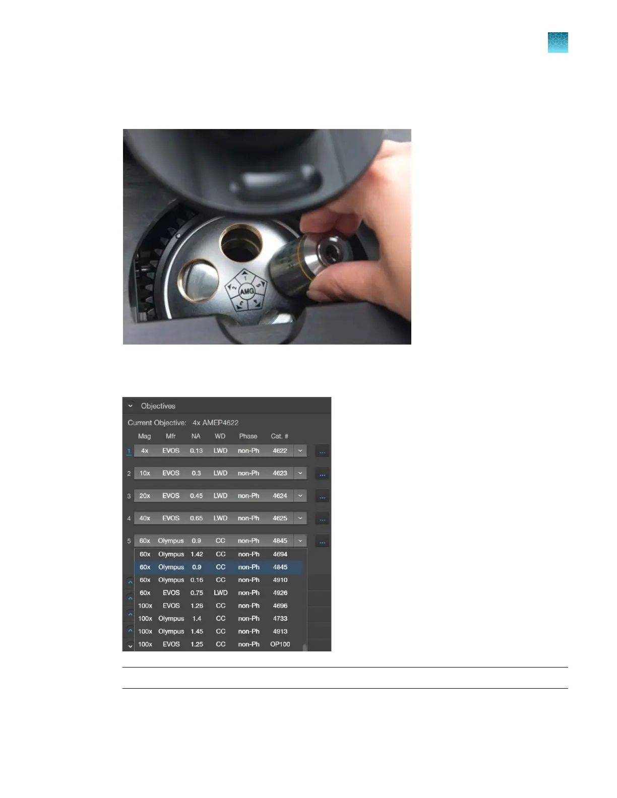 the objective and the turret position. In this example, the new objective is installed into the turret