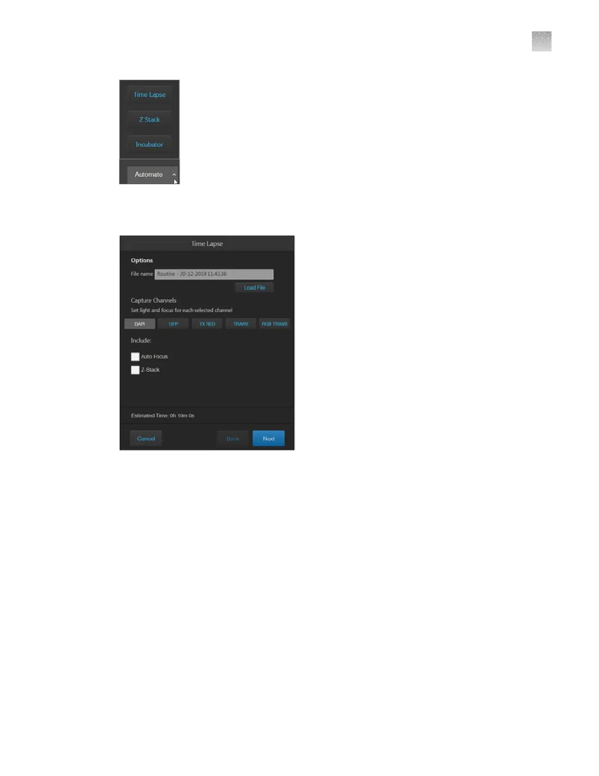 Time Lapse: Opens the Time Lapse tool, which allows you to create and run time lapse routines
