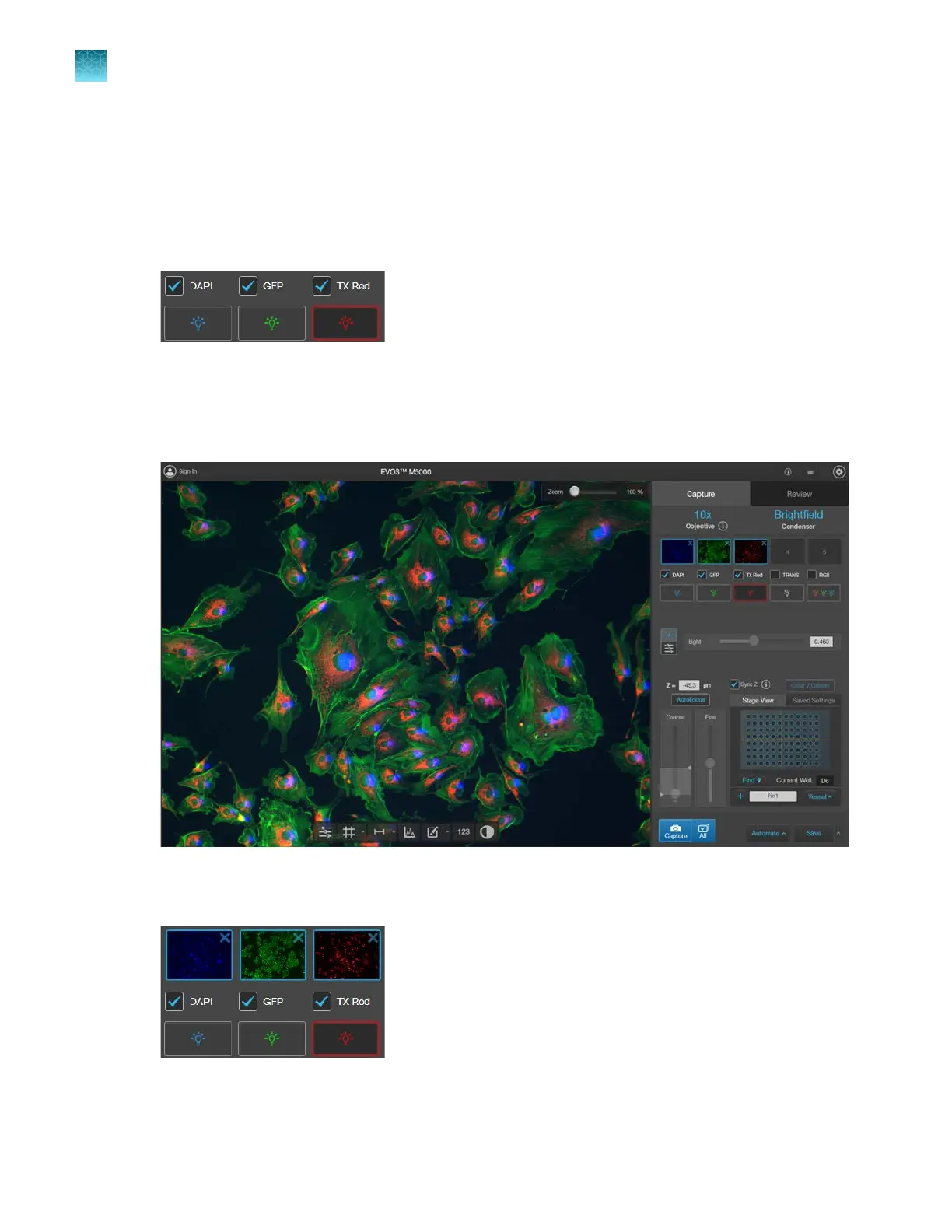 A thumbnail of the captured image is displayed for each captured channel (in this example, DAPI,