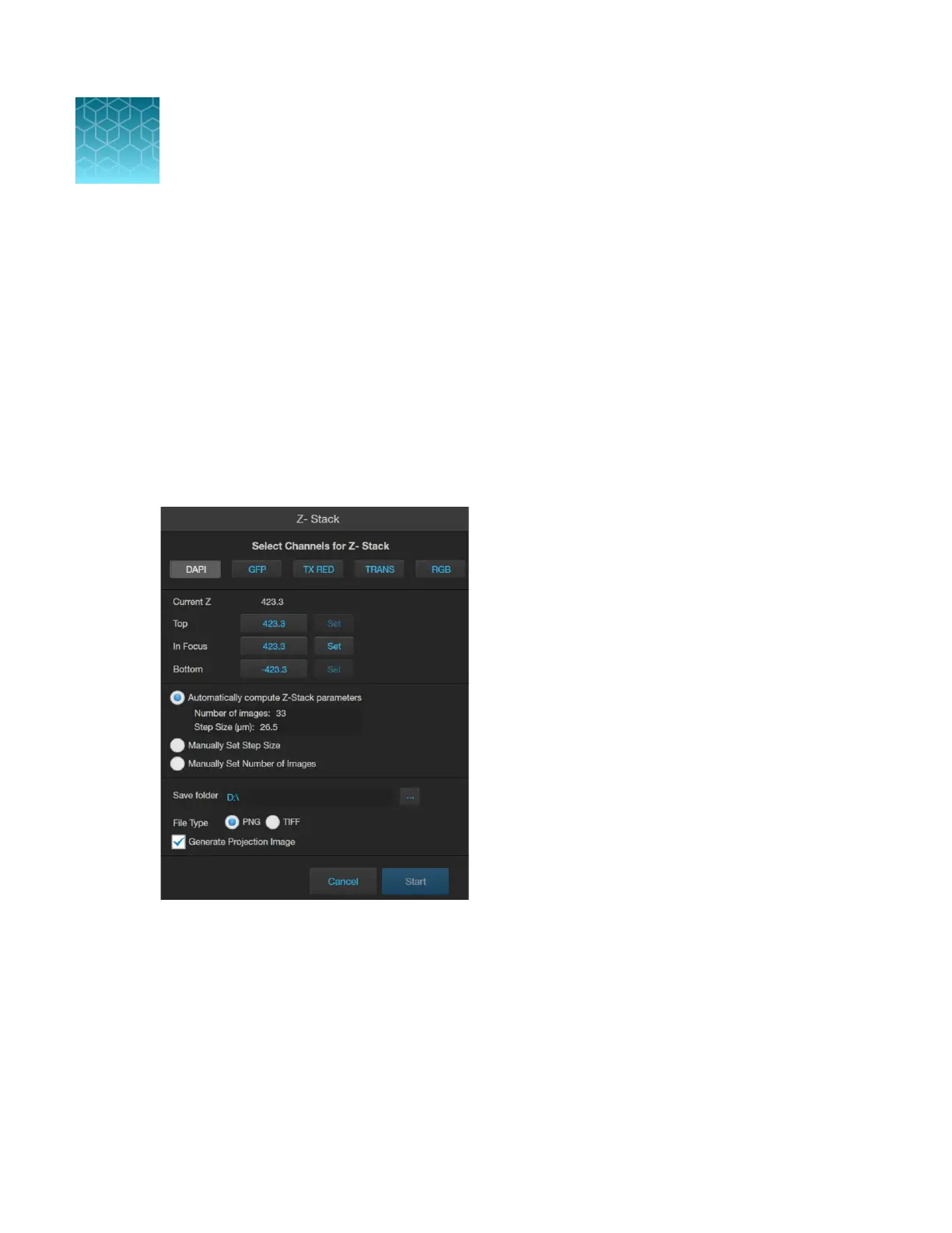 The Z-Stack tool allows you to capture multiple images of a selected field at dierent focal planes