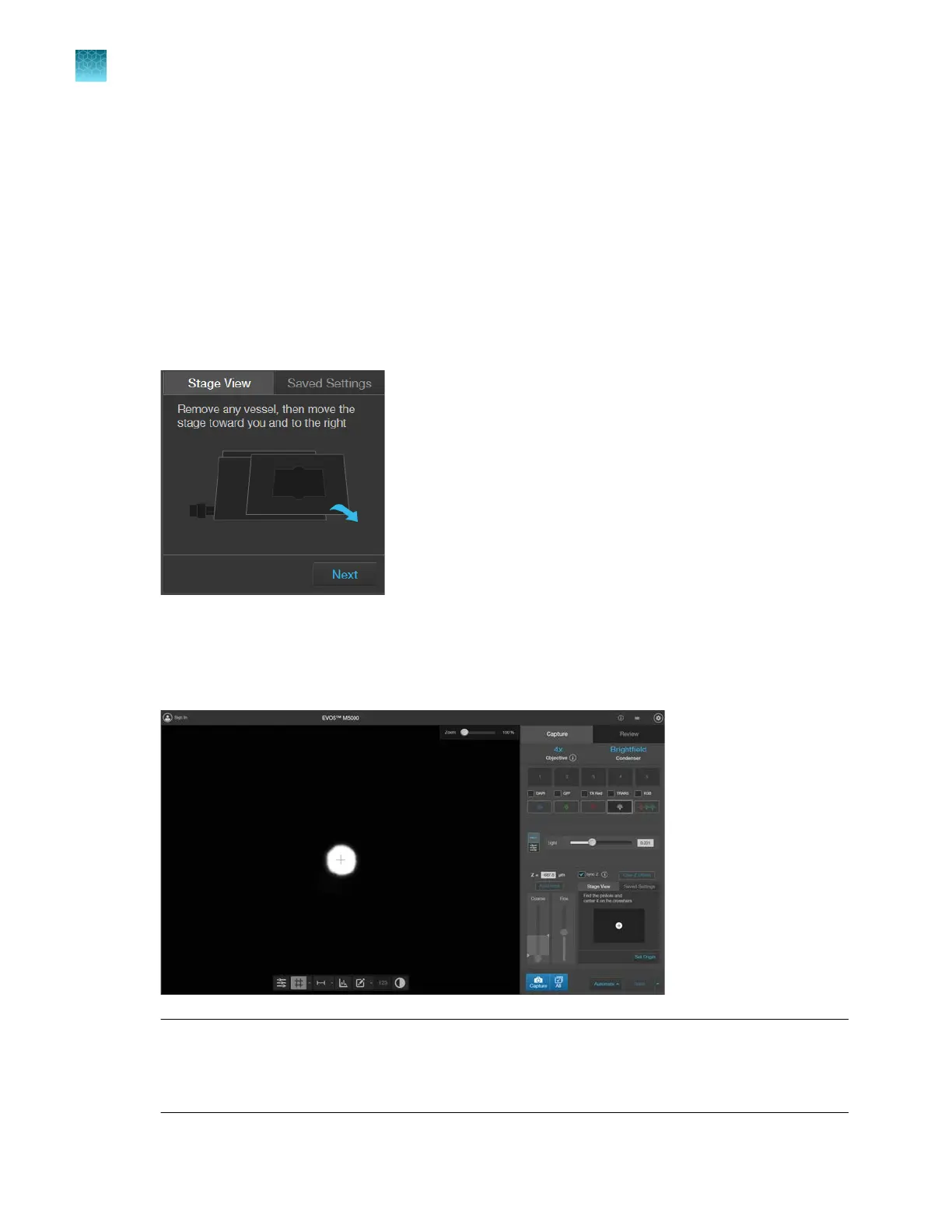 Next. This turns on the transmitted light and moves the Coarse focus slider to the bottom.