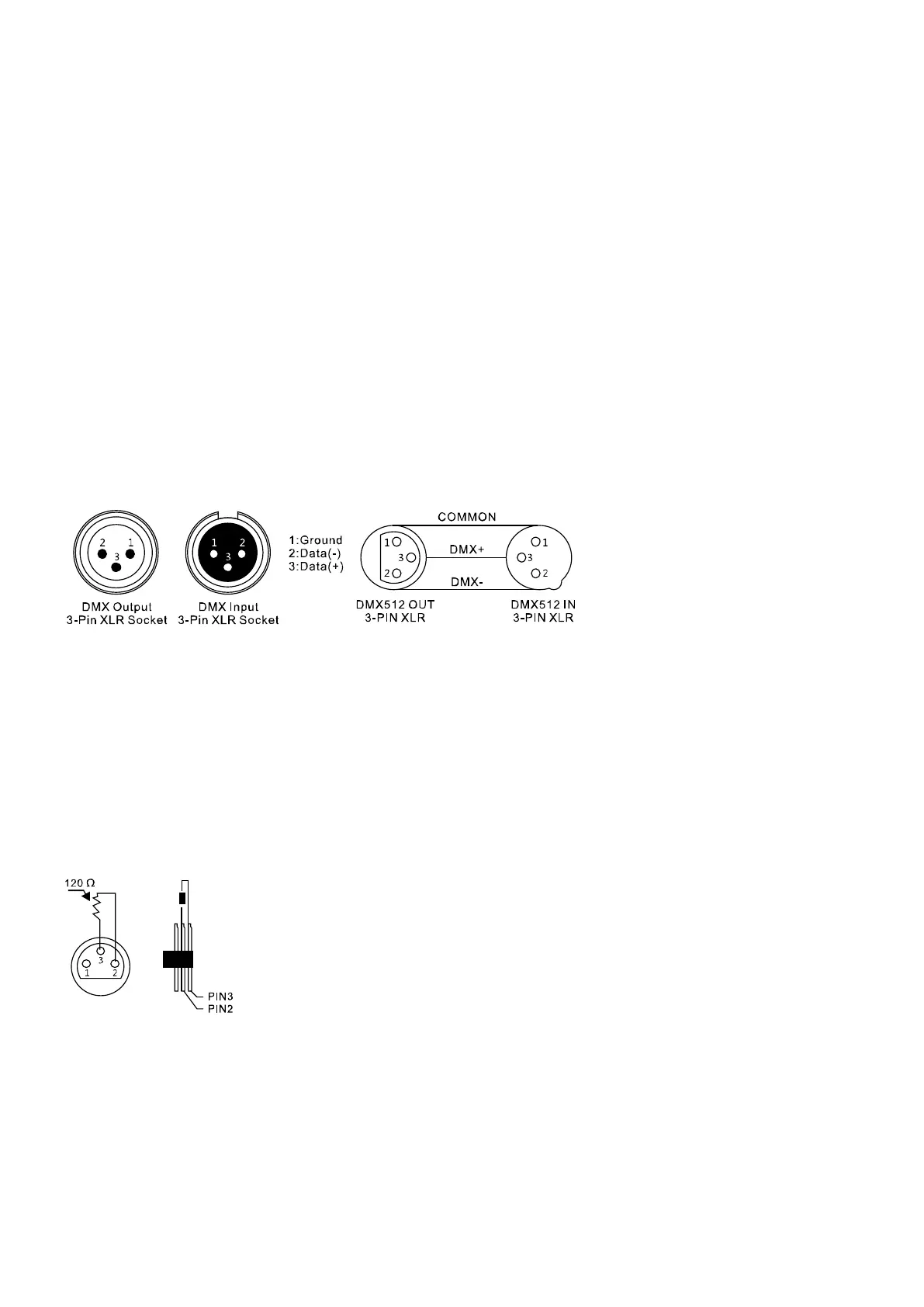 Eine dreipolige XLR-Buchse dient als DMX-Ausgang, ein dreipoliger XLR-Stecker dient als DMX-Eingang.