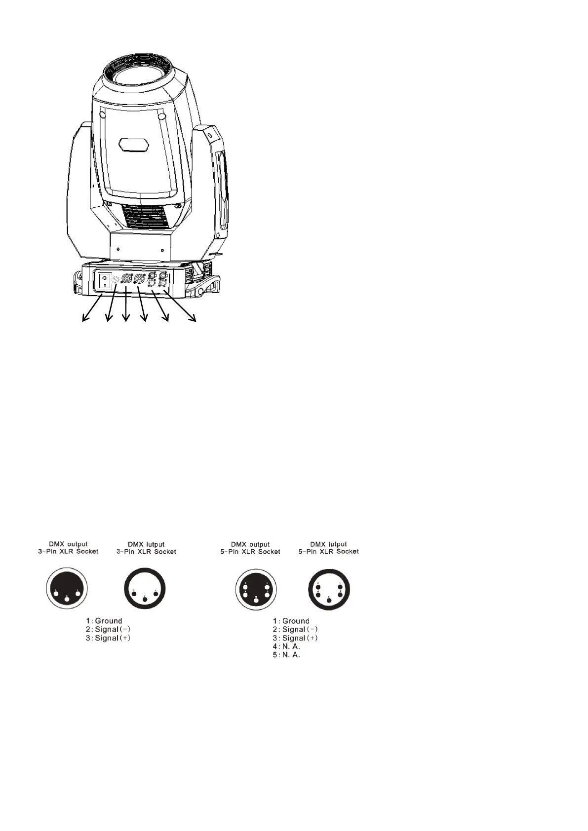 6. 3-pin and 5-pin XLR input jacks for connecting a DMX controller (such as DMX mixer).