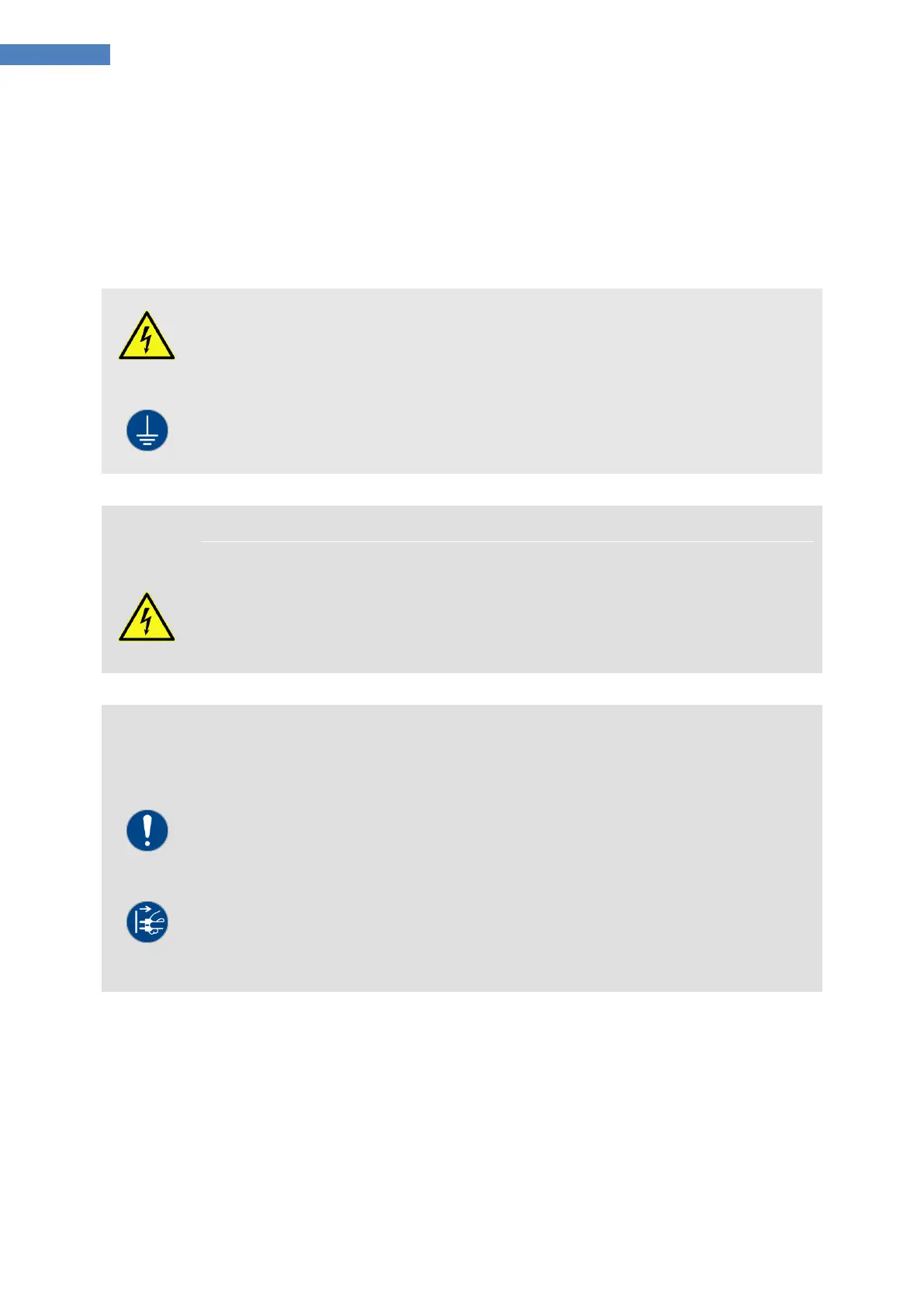 The mains plug is the disconnect element. Unplug the power cord from the power source. Make sure that the