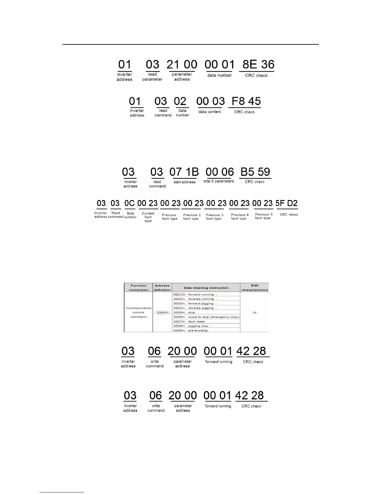 Make the inverter with the address of 03H to run forward. See table 1, the address of