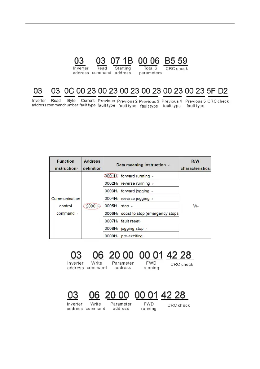 “communication control command” is 2000H and forward running is 0001. See the table below.