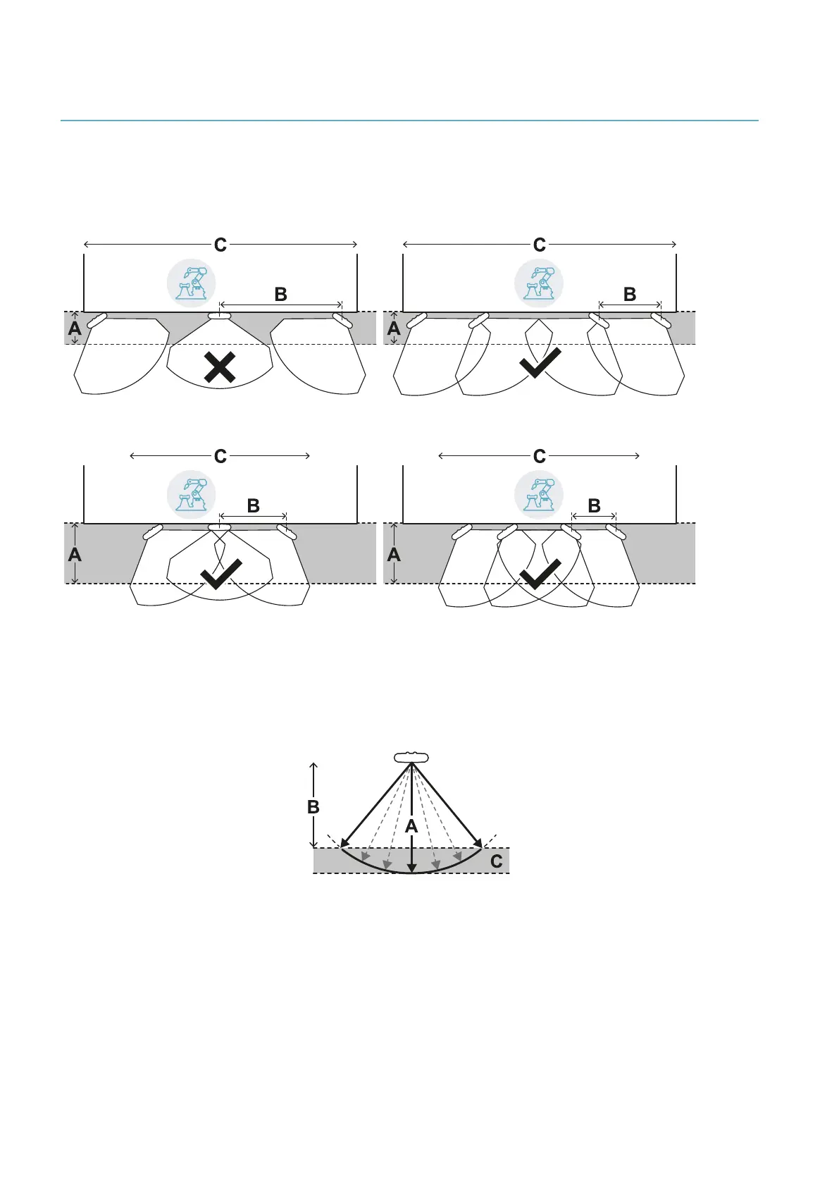 The depth of the area to be monitored [A] determines the maximum distance between the sensors [B] and