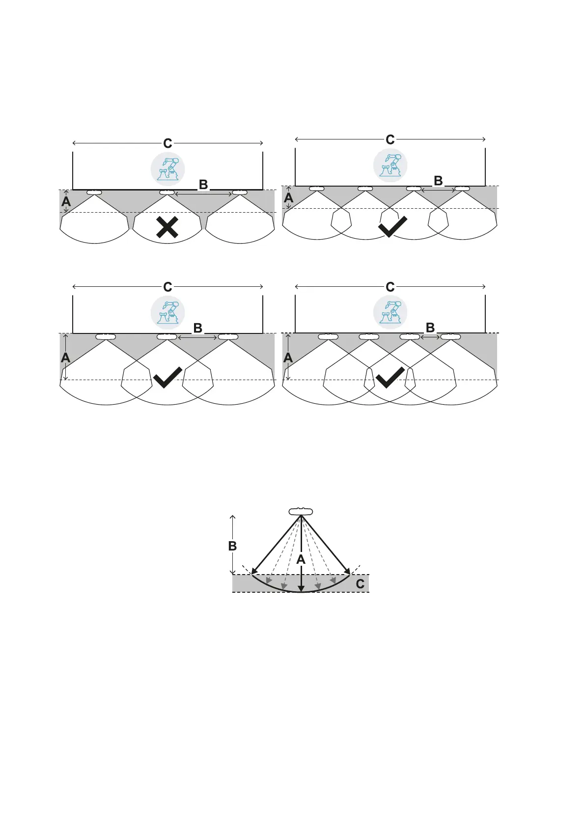 The depth of the area to be monitored [A] determines the maximum distance between the sensors [B] and