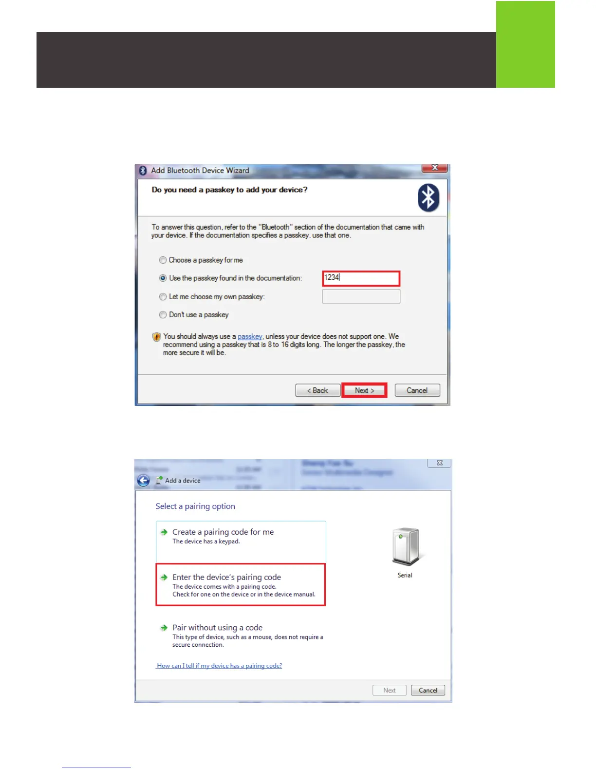 Windows 7: Click on Enter the device’s pairing code.