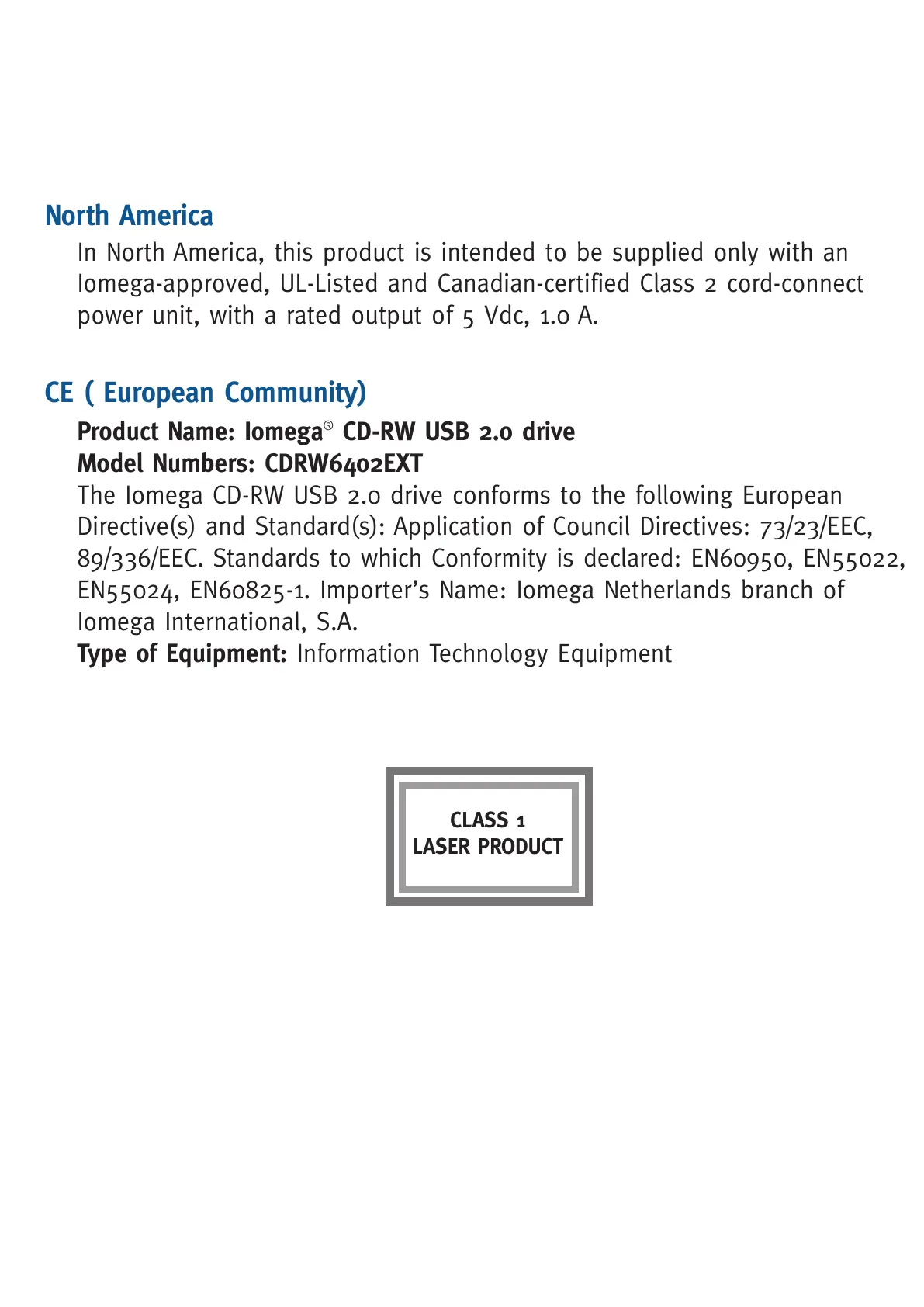 The Iomega CD-RW USB 2.0 drive conforms to the following European