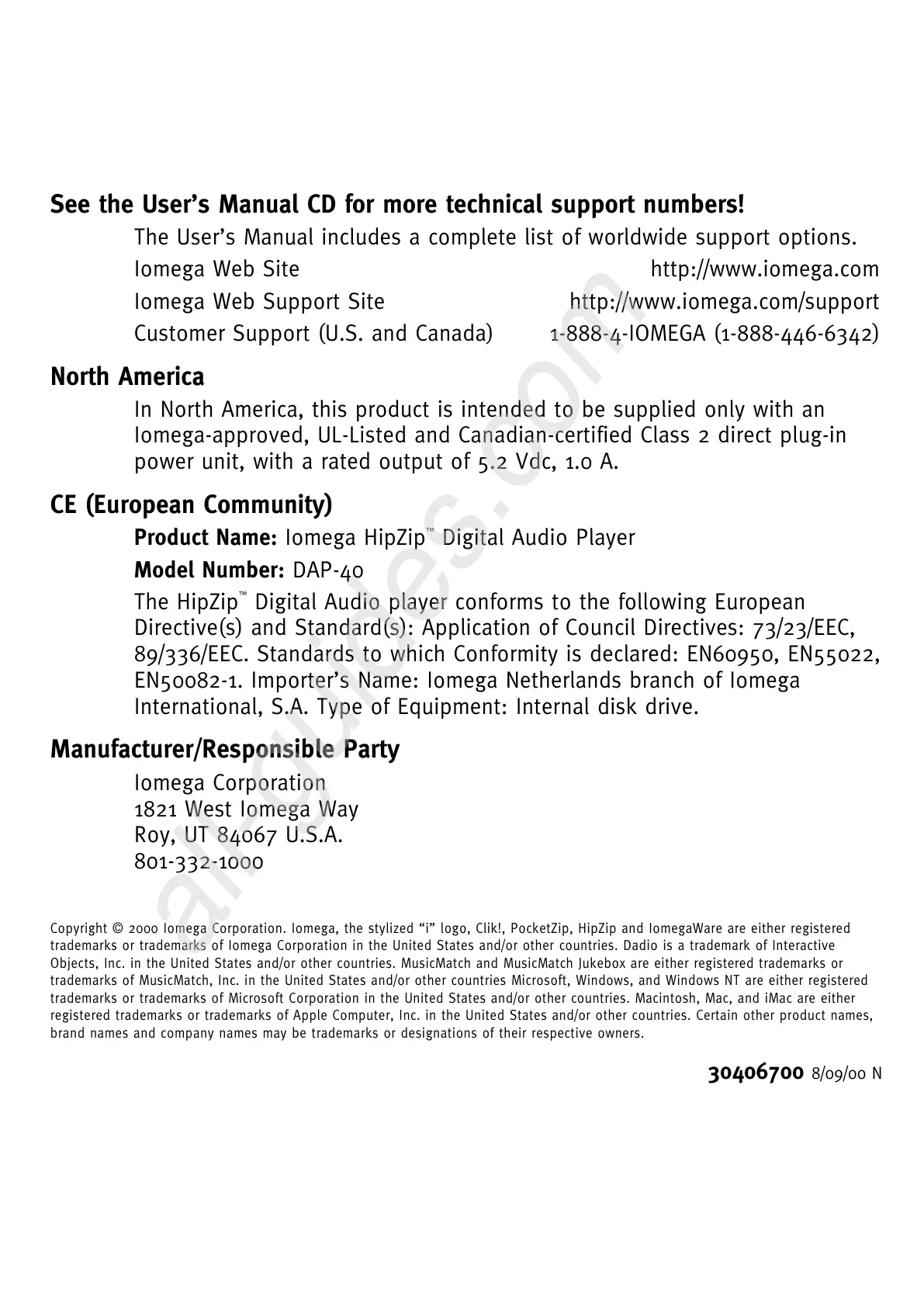 Customer Support (U.S. and Canada) 1-888-4-IOMEGA (1-888-446-6342)