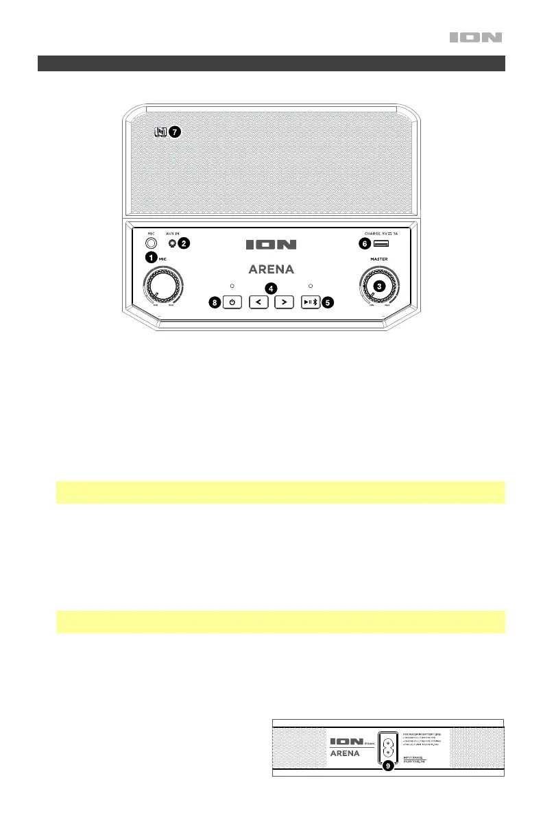 8. Ein-/Ausschalter: Halten Sie diese Taste 3 Sekunden lang gedrückt, um Arena einzuschalten/