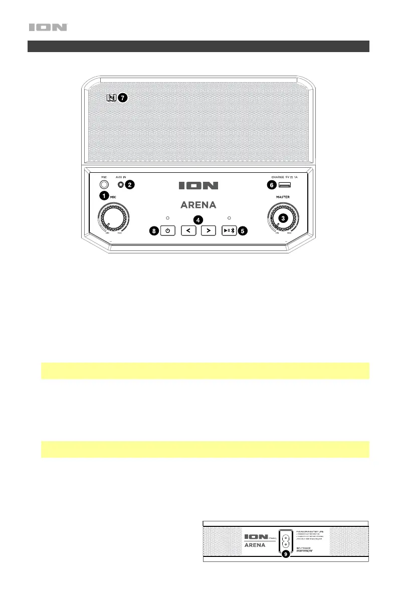 8. Aan/uit-schakelaar: Druk en houd deze knop 3 seconden lang ingedrukt om Arena aan/uit te zetten.