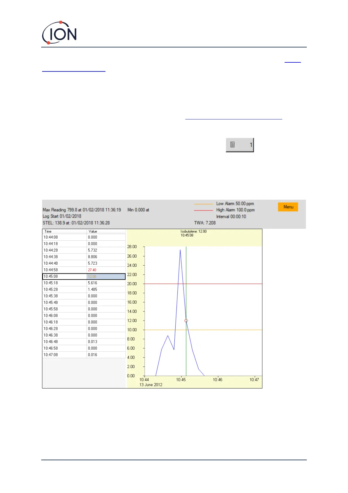 The left-hand area lists the time and gas level of each reading. Red values indicate that the reading