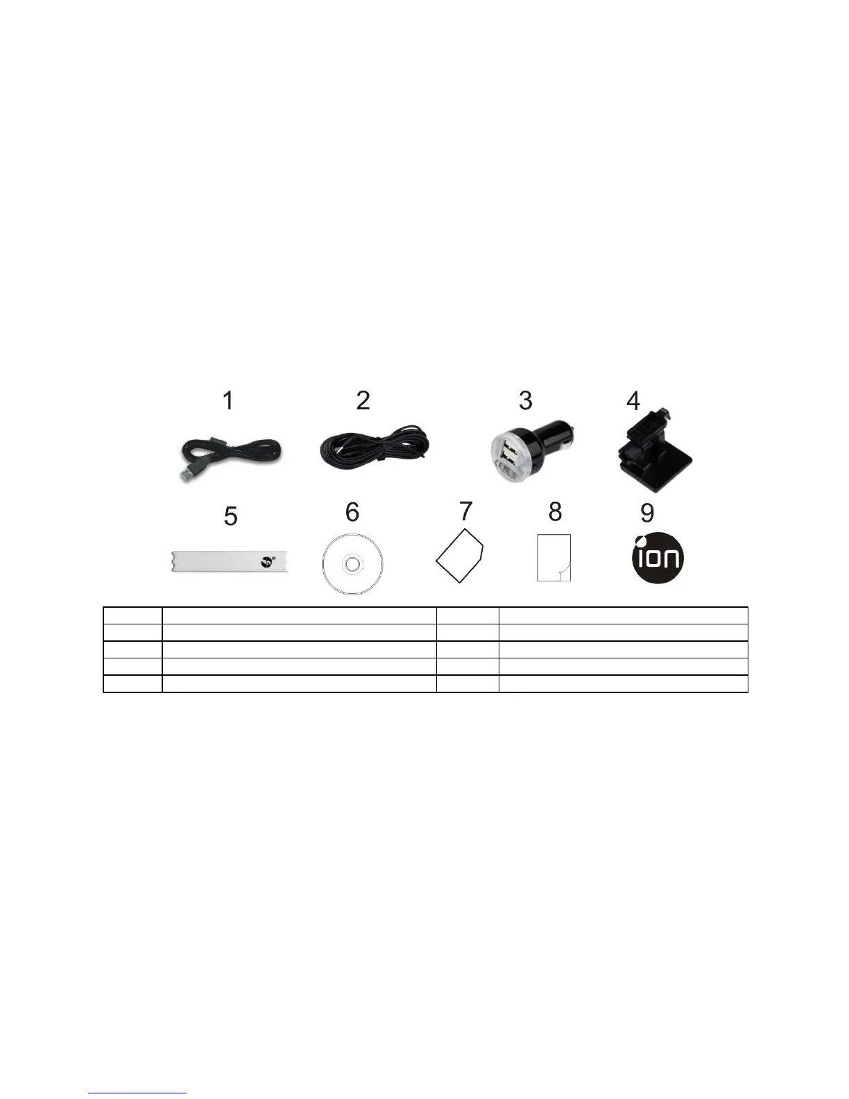 ION DashCam - Contenido del Embalaje; Piezas Funcionales