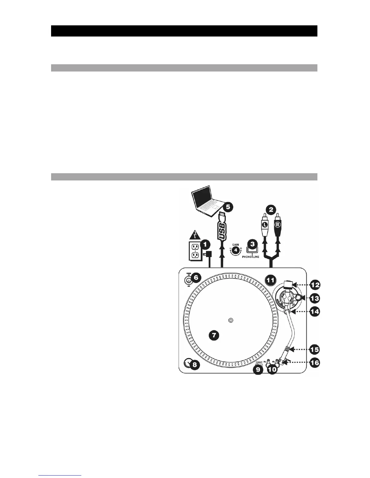 5. Sortie audio USB : Branchez la table tournante à votre ordinateur en utilisant le câble USB fourni. Pour