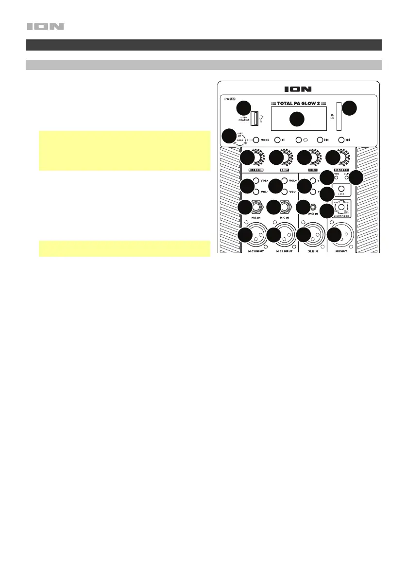 16. Témoin d'alimentation DEL : Indique si l'enceinte Total PA Glow 3 est sous ou hors tension.