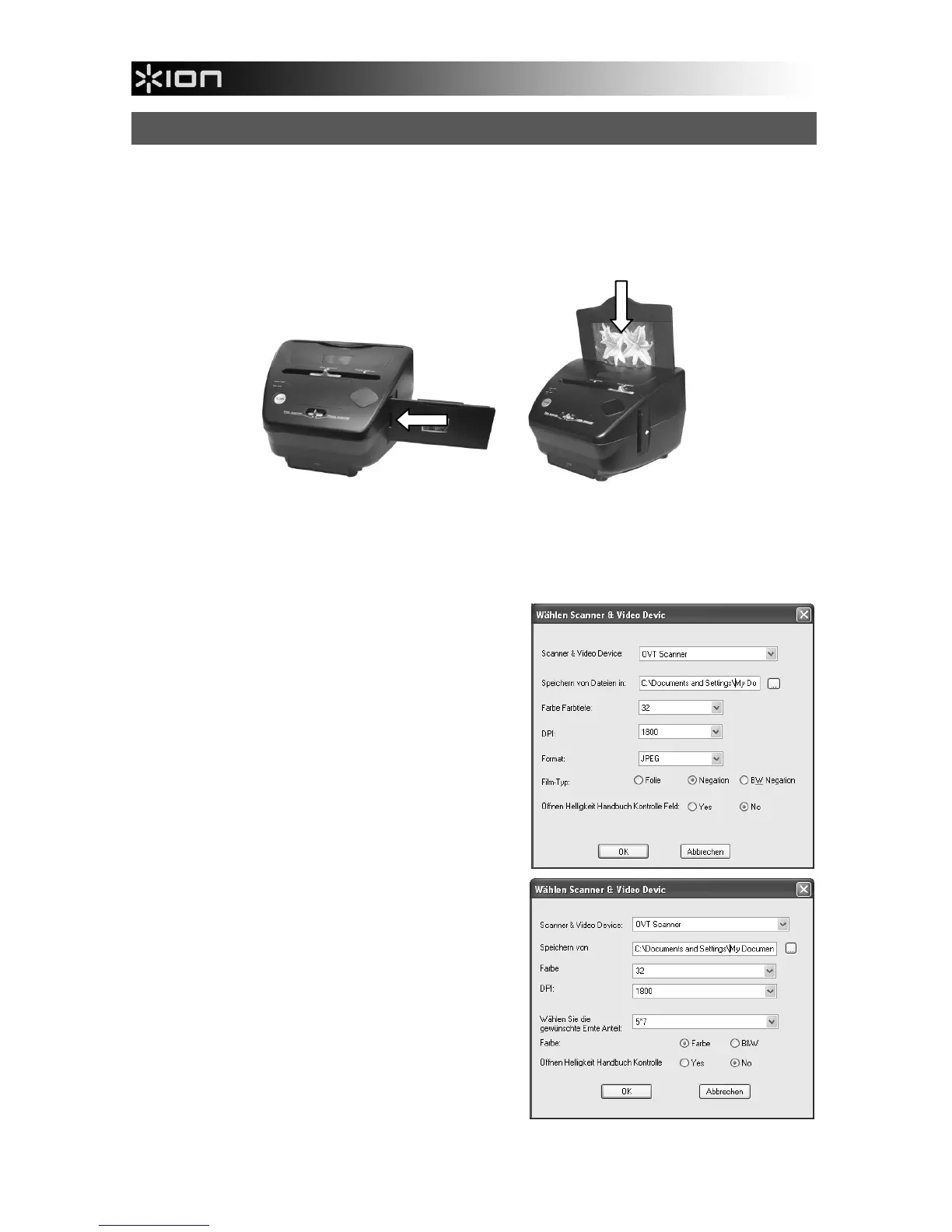 1. Dia, Negativ oder Foto in den dafür vorgesehenen Halter einlegen. (Weitere Informationen hierzu im