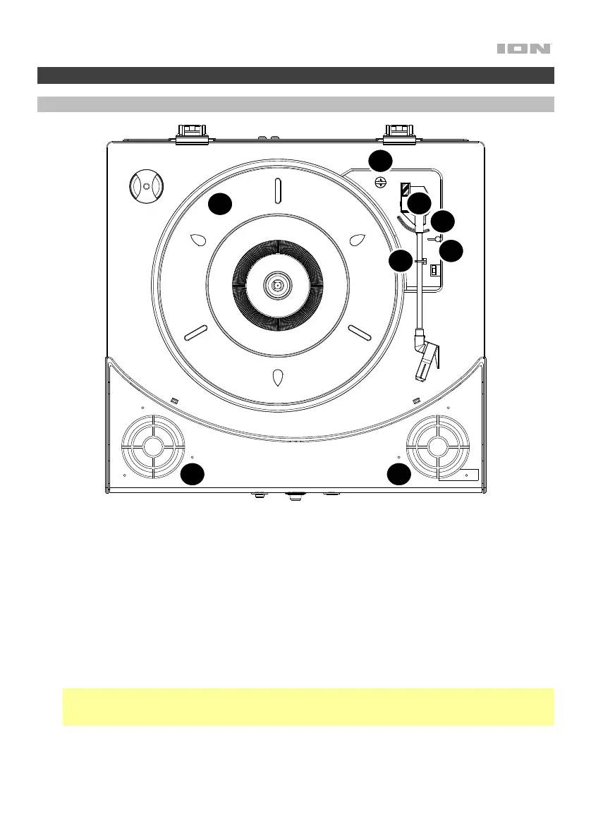 7. Altavoces: Reproduce el audio de su disco de vinilo y la entrada auxiliar.