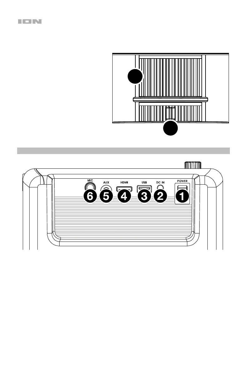 5. Entrada auxiliar (1/8 pulg. / 3,5 mm): Conecte un reproductor de MP3 u otra fuente de audio a esta