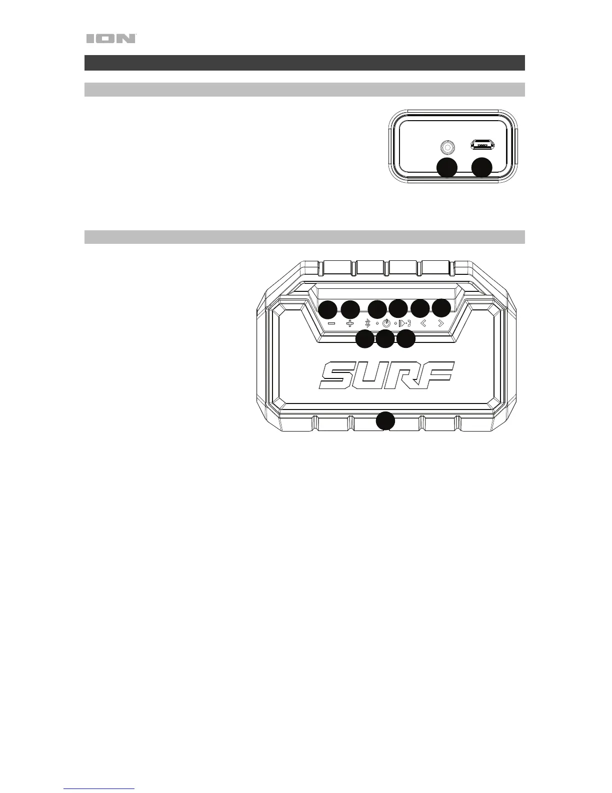 9. Volume giù: premere questo tasto per abbassare il volume dell'altoparlante del Surf.