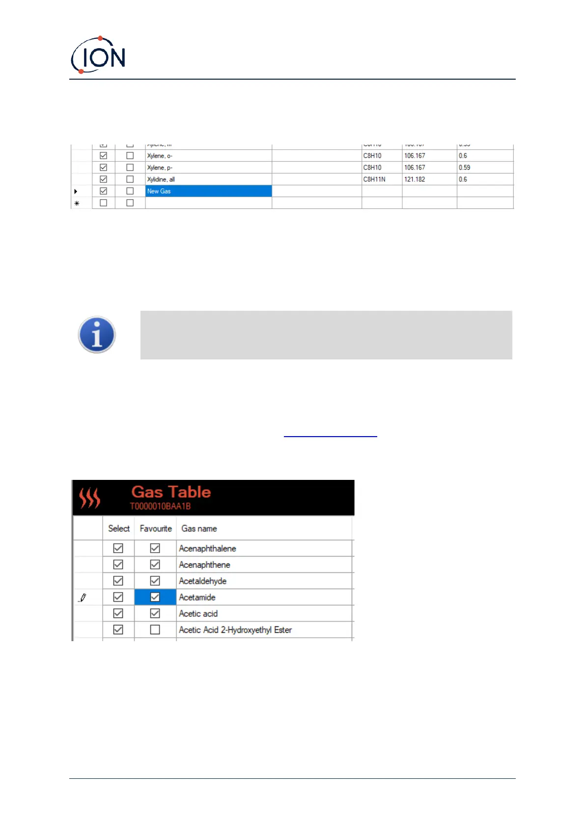 Select gases in the Favourite column to create a Favourites Gas Table. The Favourites Gas Table can