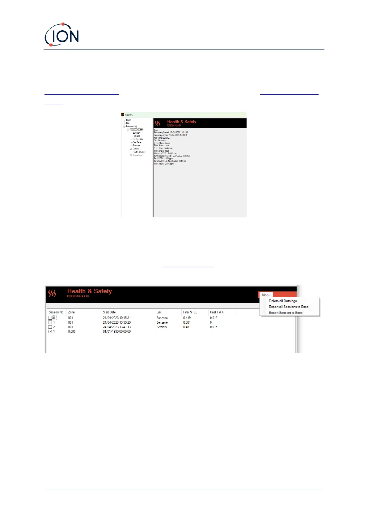 This screen displays the latest Health and Safety readings held on your TIGER XT, if the relevant