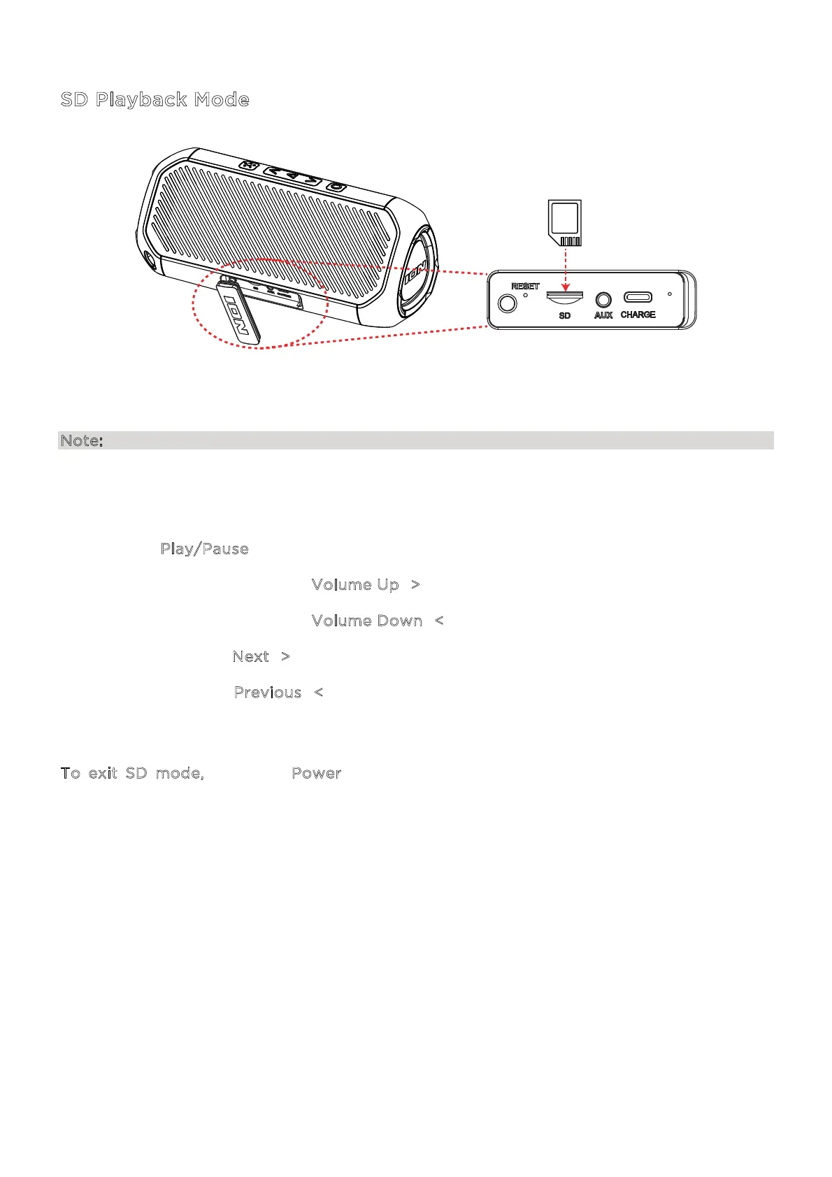 To exit SD mode, press the Power button to switch to Bluetooth or Aux playback (if an