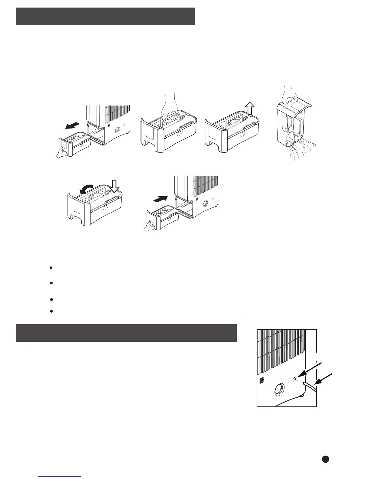 Pull bucket out Lift by the handle Remove the cover Pour the water away