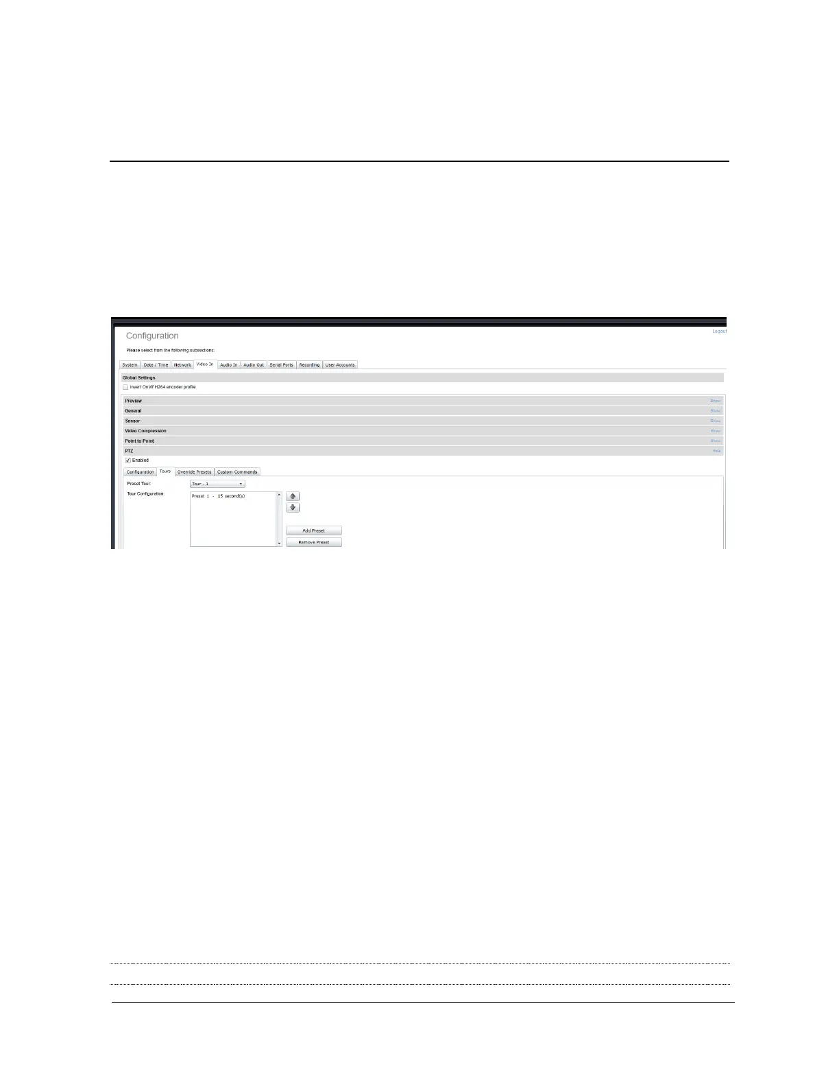 The PTZ preset tours can be set up from the PTZ sub-section of the video input configuration