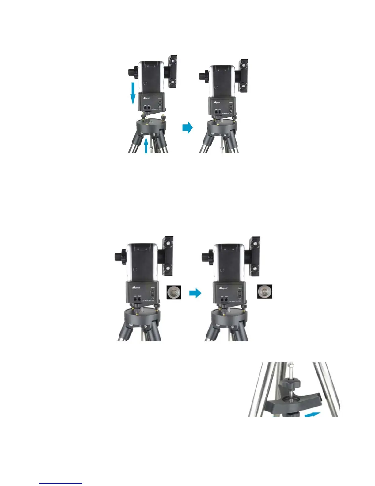 Carefully position telescope mount onto the tripod by aligning the three holes on the bottom of