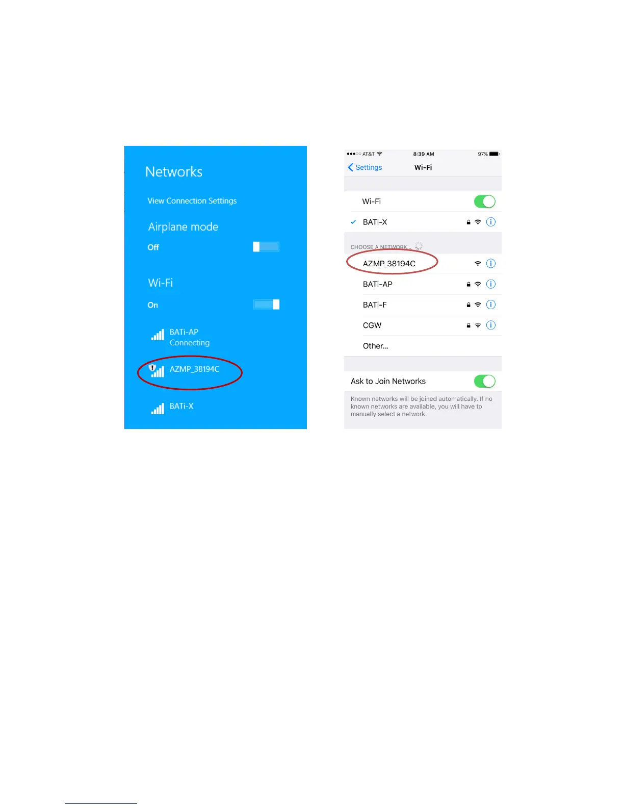Connect the iOS Tablet/SmartPhone to the AZMP_XXXXXX wireless network, as shown in