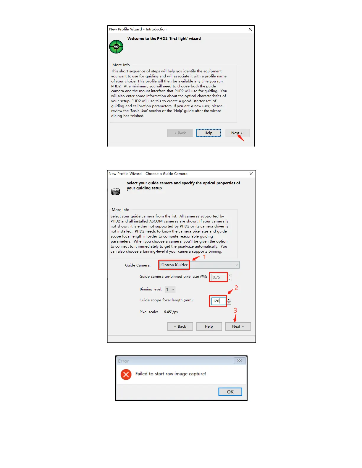 Select “iOptron iGuider” camera. PHD2 will fill the pixel size (3.75um) automatically. Enter