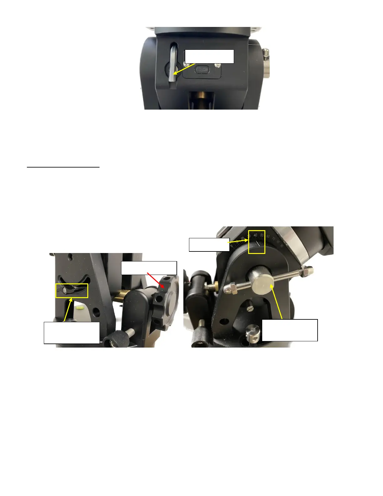 the Latitude Adjustment Knob to move the mount to the desired latitude by aligning the scale to the latitude